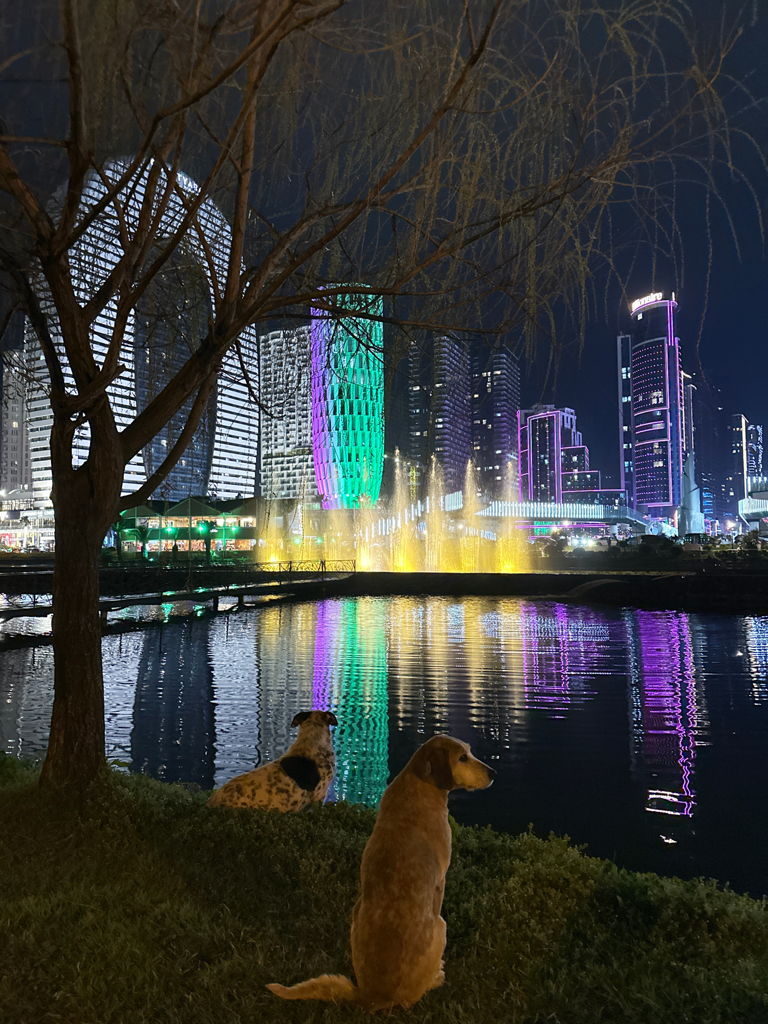 A nighttime scene shows the city of Batumi, Georgia reflected in a body of water, likely a lake or the sea. In the foreground, a bare tree stands to the left, while two dogs are positioned to the righβ¦read more