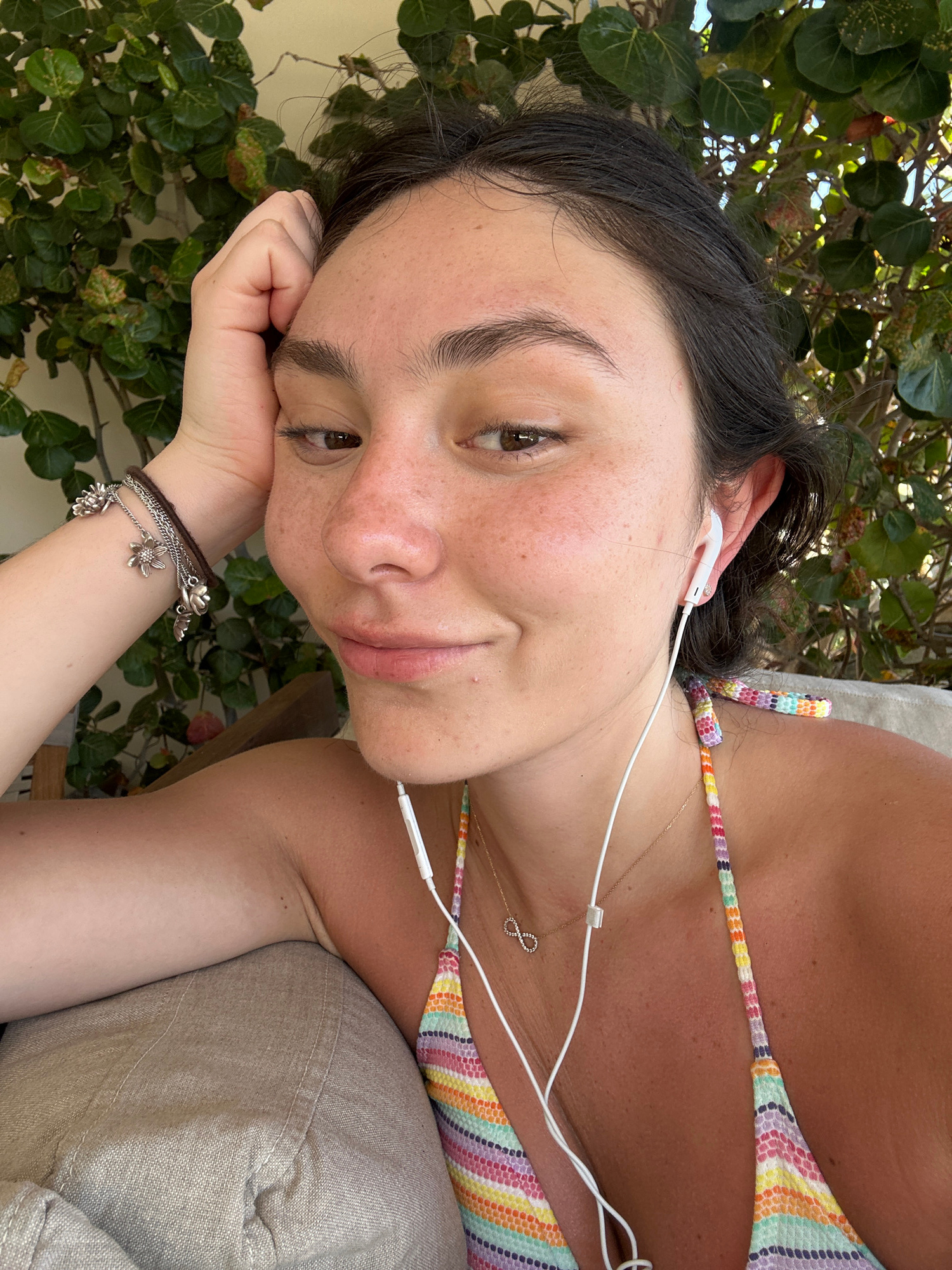 A young adult female is depicted in a close-up, chest-up shot, reclined outdoors in Playa Blanca, Mexico. She has fair skin with numerous freckles and dark hair, and her brown eyes are directed toward…read more