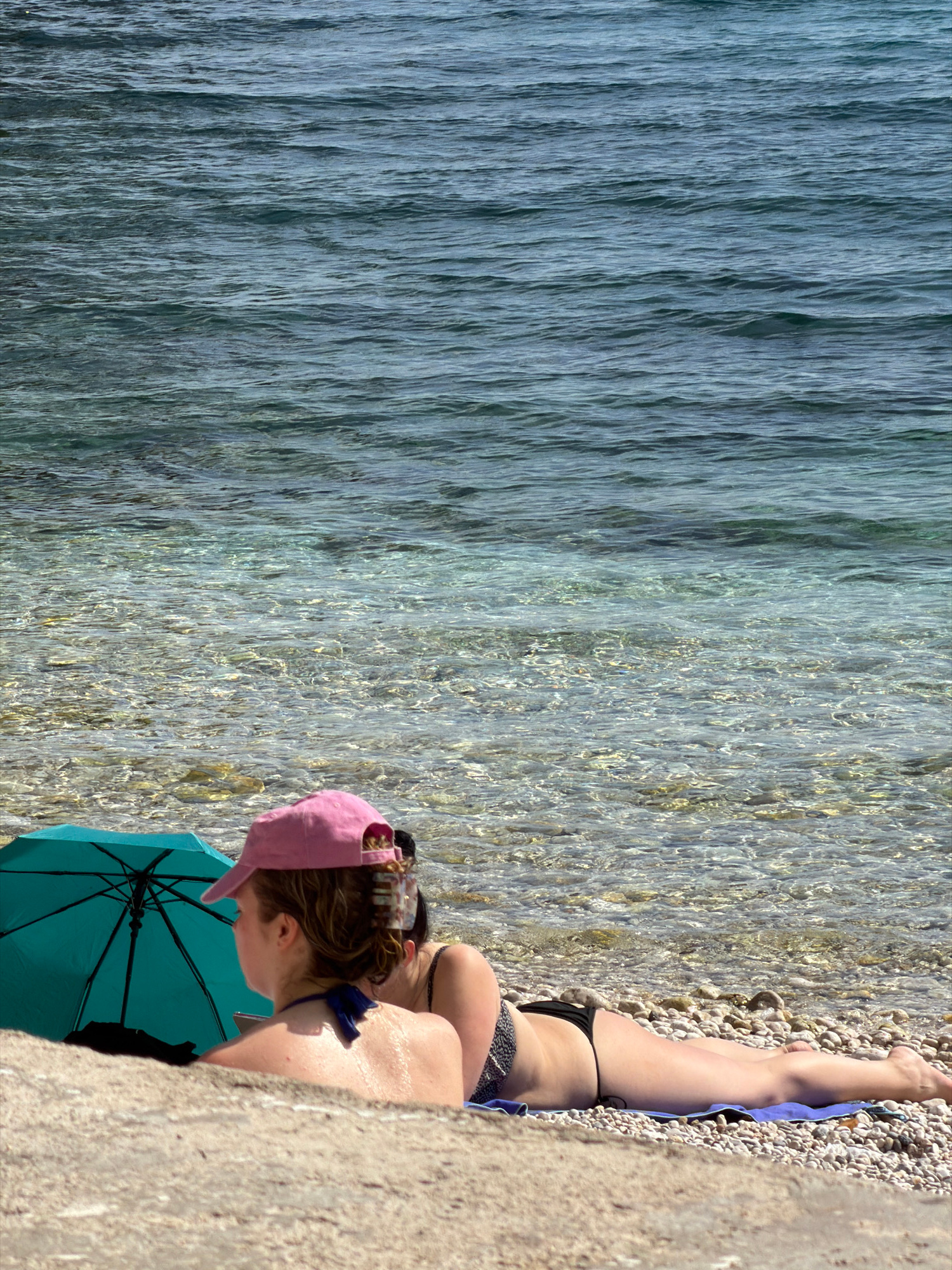This image captures a bright, sunny day at a pebbly beach in Grad Rijeka, Croatia. The primary subject is a person, likely a woman, seen from the waist down to her head, lying on her stomach. She is w…read more