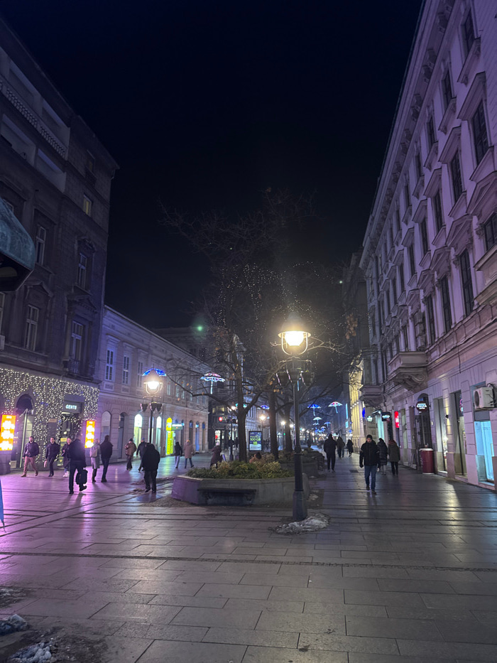 A nighttime street scene with buildings lining either side of a pedestrian walkway. Lights illuminate the street and businesses, creating a warm glow. People stroll along the path. Trees with bare bra…read more