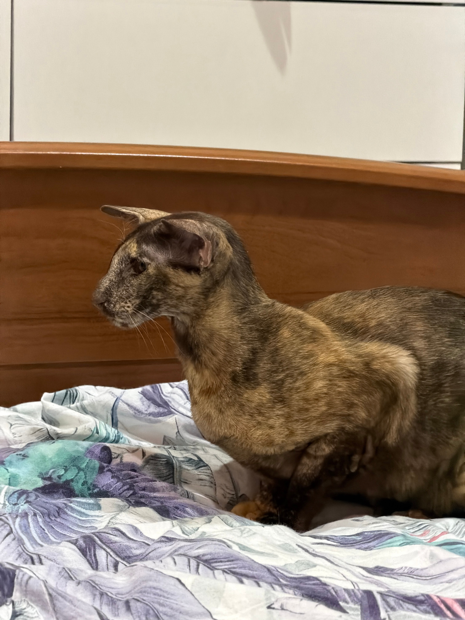 A tortoiseshell cat is perched on the edge of a wooden structure, with a patterned cloth draped nearby. The background includes a white wall. No information indicates this image was taken in Chaikovskβ¦read more