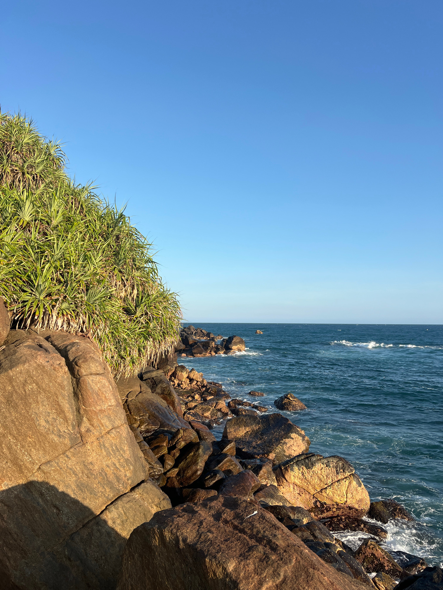 The image displays a rocky coastal landscape located in Goviyapana, Sri Lanka, under a clear, unobstructed light blue sky. The upper two-thirds of the frame consist entirely of the sky, with a faint h…read more