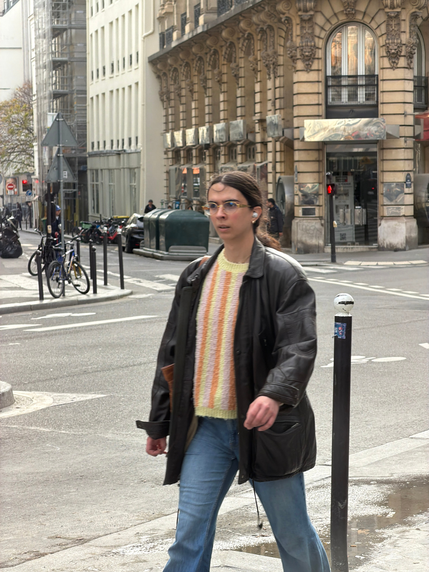 A person with long brown hair, wearing eyeglasses, a striped pastel sweater, and a black leather jacket, is standing on a sidewalk next to a street. The person is wearing blue jeans. The sidewalk is m…read more