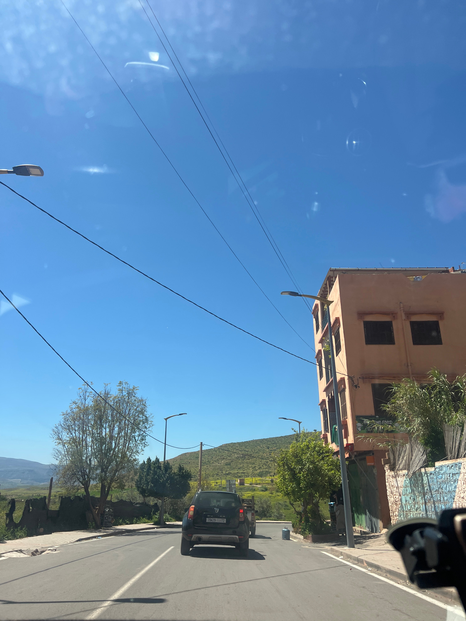 The image shows a street in Ouaouizert, Morocco, viewed from a vehicle. A two-story building with multiple windows is on the left side of the frame. Power lines stretch across the clear blue sky. A bl…read more