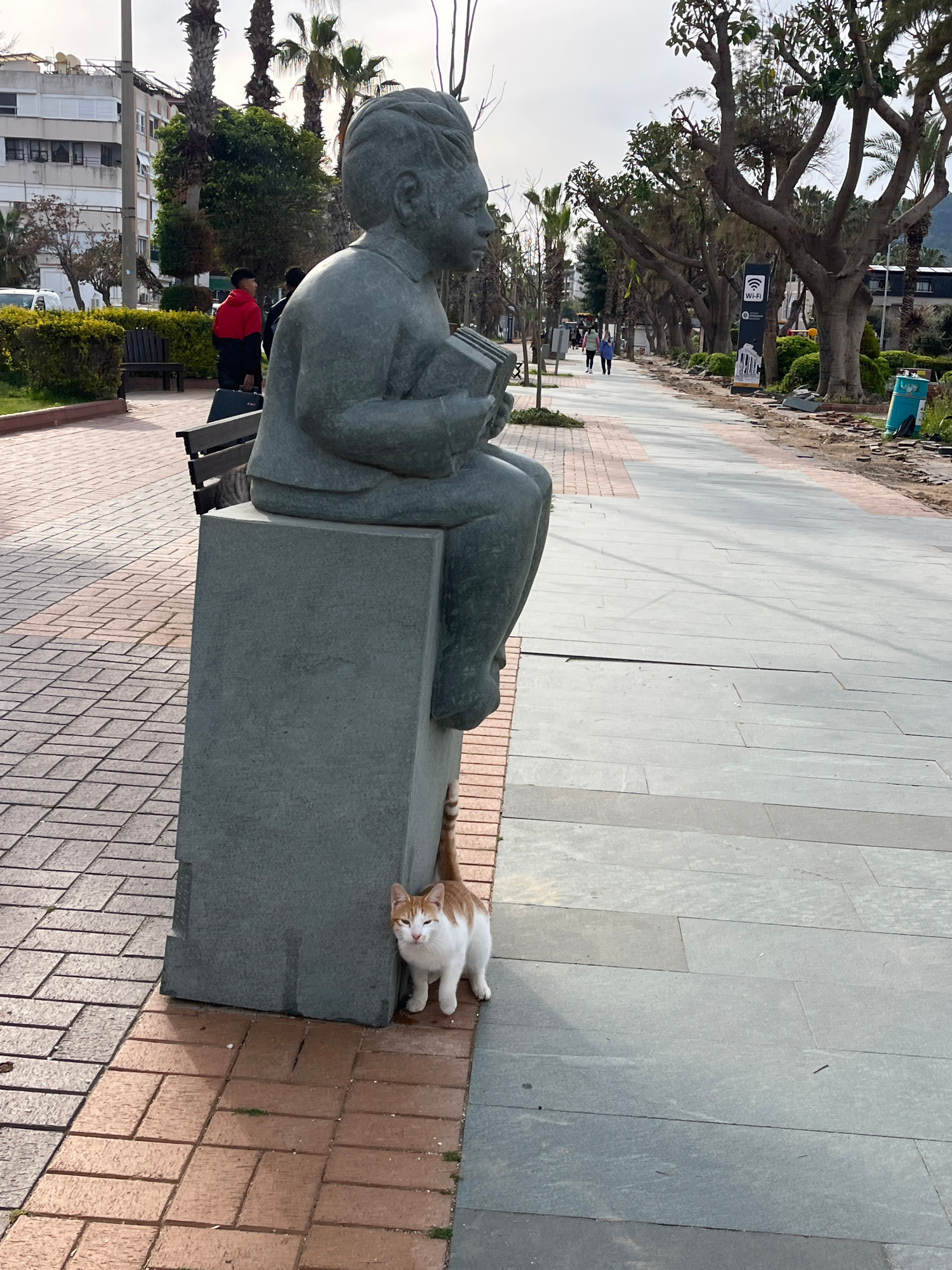 A statue of a seated person, apparently reading a book, is in the foreground on a paved walkway. A white and orange cat lies on the ground beside the base of the statue. In the background, there is a…read more