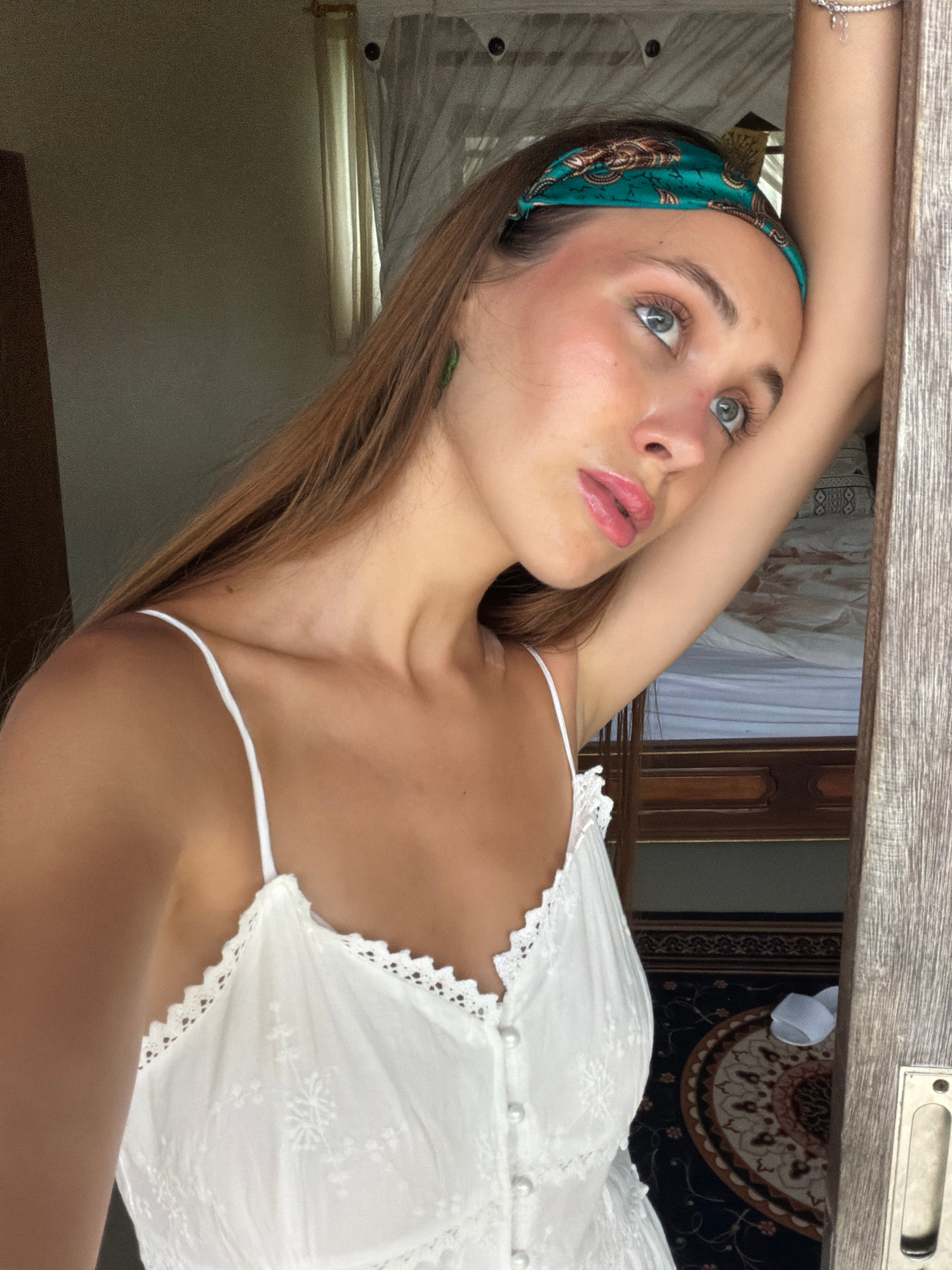 A fair-skinned young woman with light brown hair and a teal patterned headband is the primary subject of the image, which is oriented at an angle. She is wearing a white, lacy, spaghetti-strap top ado…read more