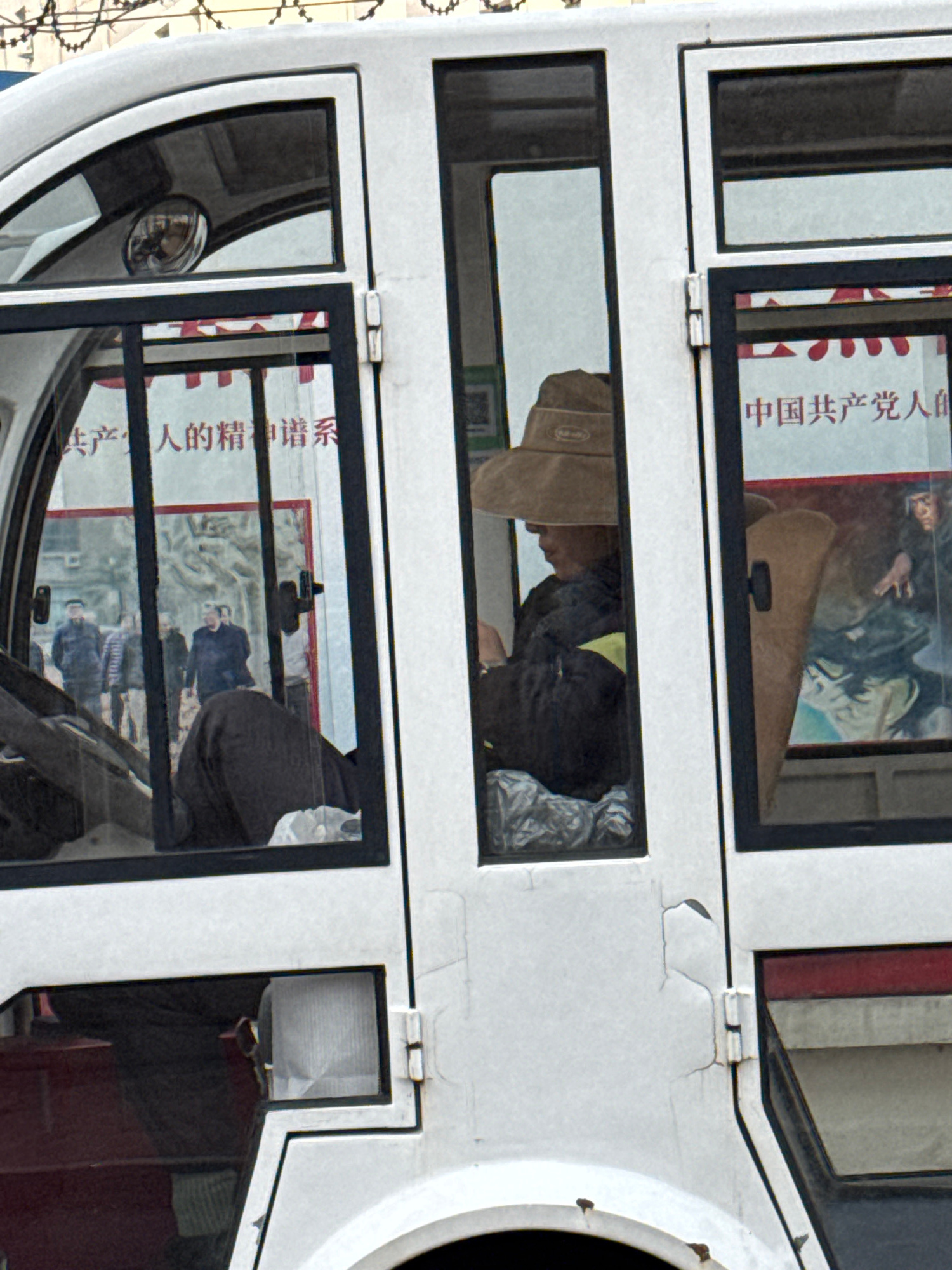 A vertically oriented image depicts a double-decker bus, likely in Zhongtun, China. Through the bus windows, one can see passengers and posters. The top window has a poster in Chinese, possibly with aβ¦read more