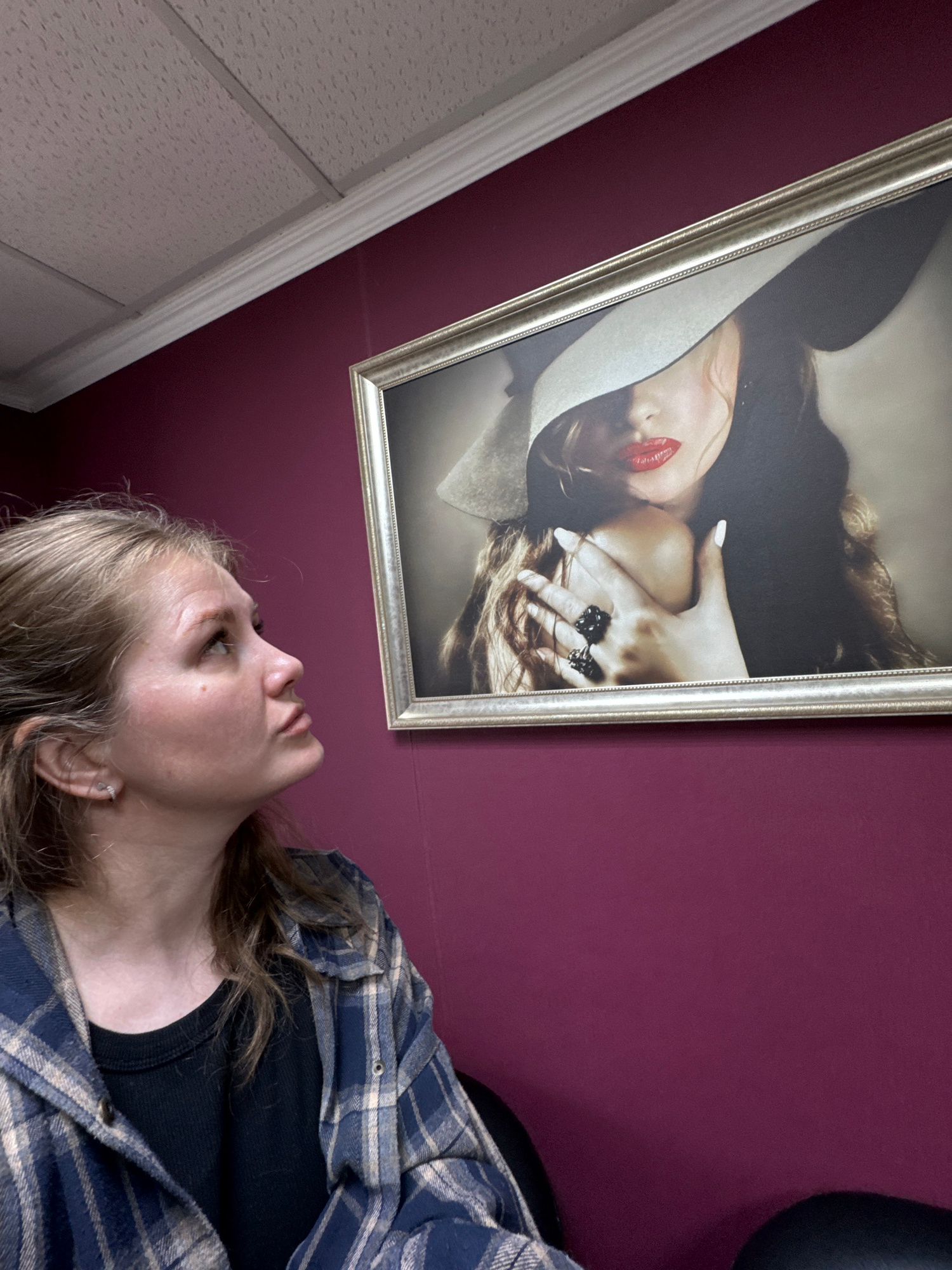 A person wearing a blue and tan plaid shirt and black shirt is looking up at a framed picture hanging on a maroon wall. The picture is of a woman with red lipstick, a white hat, and a hand with rings…read more