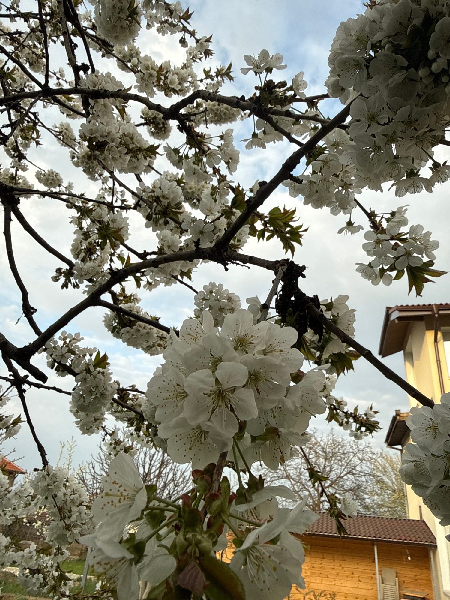 The image, likely taken in Berkovitsa, Bulgaria, shows a view looking upwards into a flowering tree against a backdrop of a partially cloudy sky. The tree branches are dark and bare except for the abu…read more