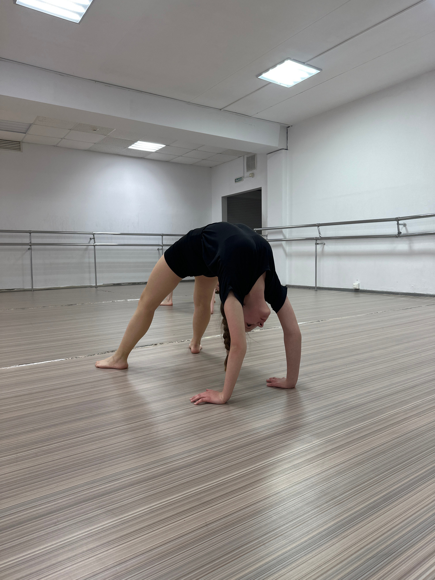 A woman in a black shirt and black shorts is performing a backbend on a floor in a dance studio. Her hands and feet are flat on the floor for support. The studio has gray-toned floor panels, white wal…read more