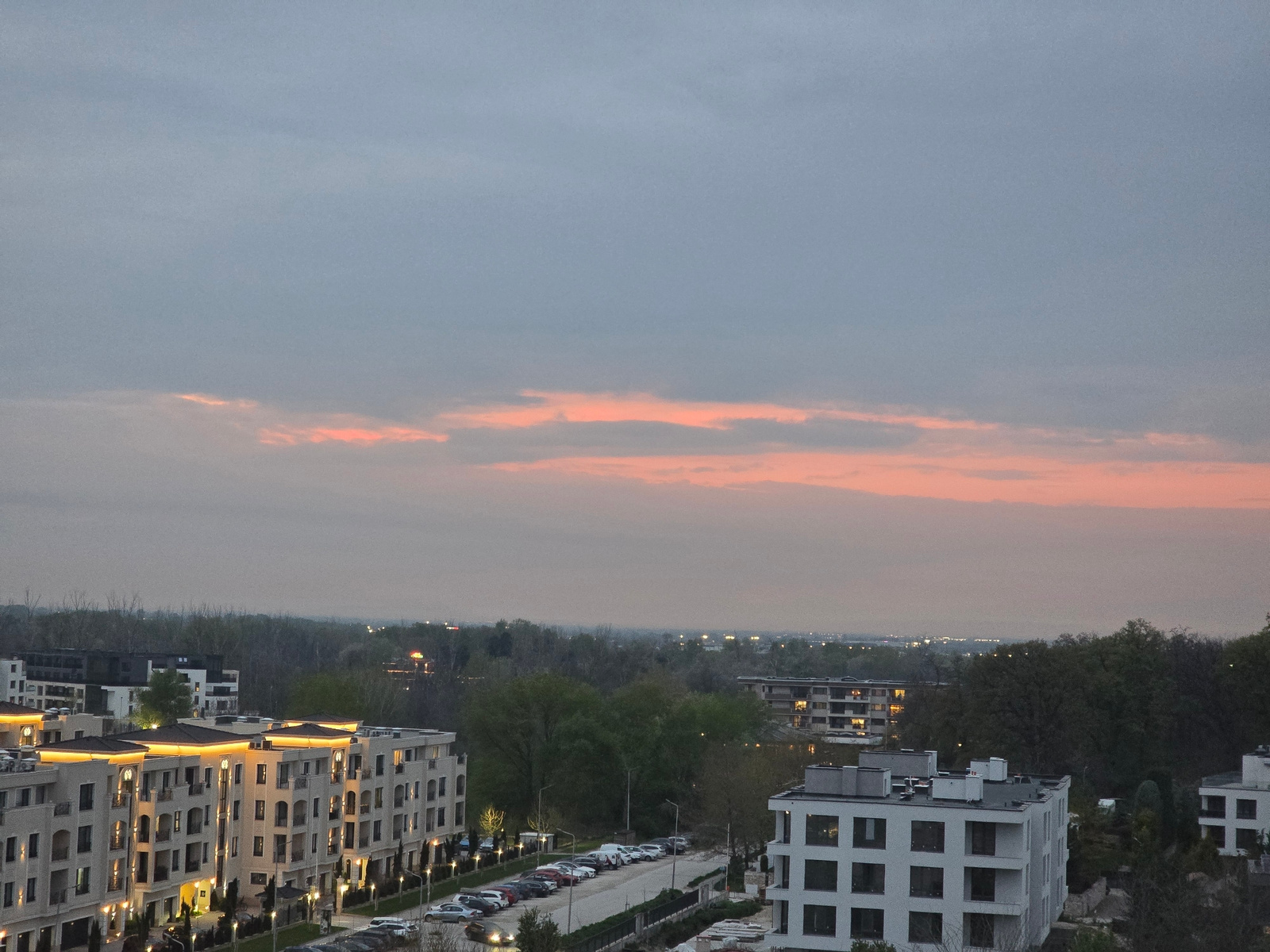 The image presents an elevated view of a residential area at dusk or dawn. The sky is largely overcast with soft grey clouds, but a prominent band of delicate pink and orange clouds stretches across t…read more