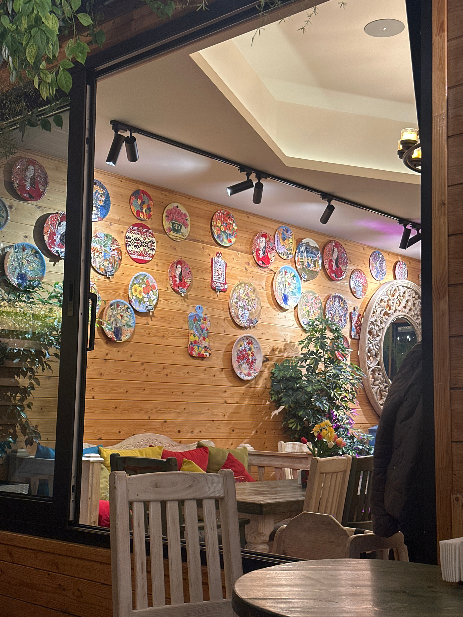The image depicts a wall inside a building in Tsakhkadzor, Armenia. The wall is adorned with a collection of decorative plates and a round ornate mirror. A spotlight track runs along the wall, illumin…read more