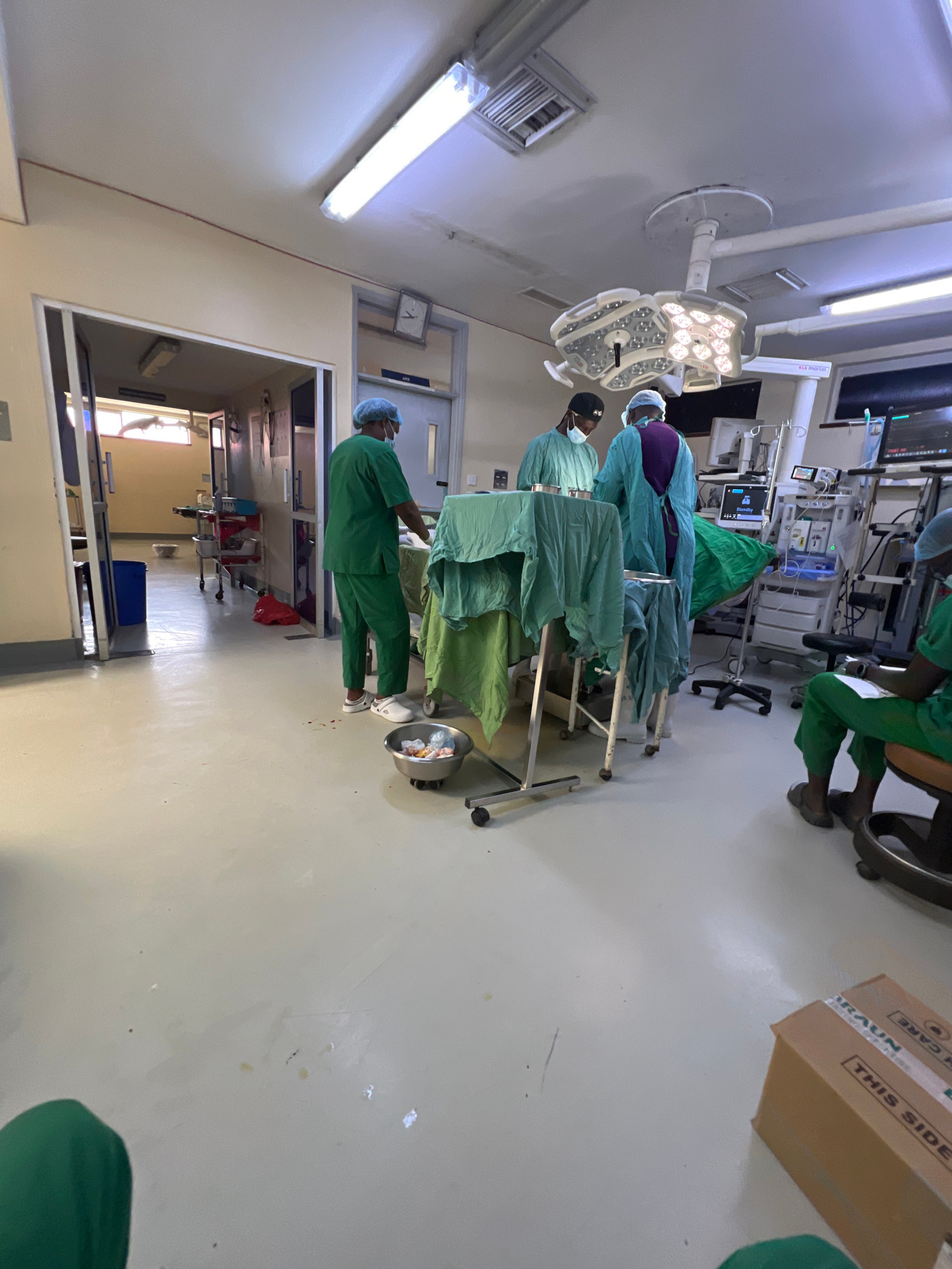 The image depicts a surgical operating room, possibly located in Nairobi, Kenya. The room is brightly lit with overhead surgical lights. Several individuals dressed in green surgical scrubs are presen…read more
