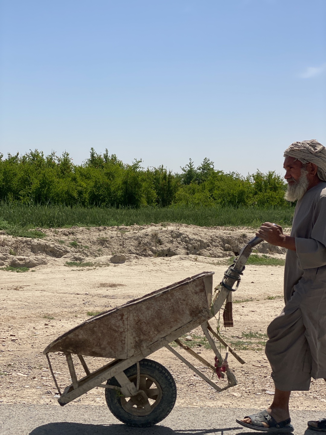 An elderly man with a white beard and a turban is pulling a rusted, one-wheeled cart in Deh-E Bagh, Afghanistan. He is wearing a loose-fitting, light-colored robe and sandals. The cart is mostly empty…read more