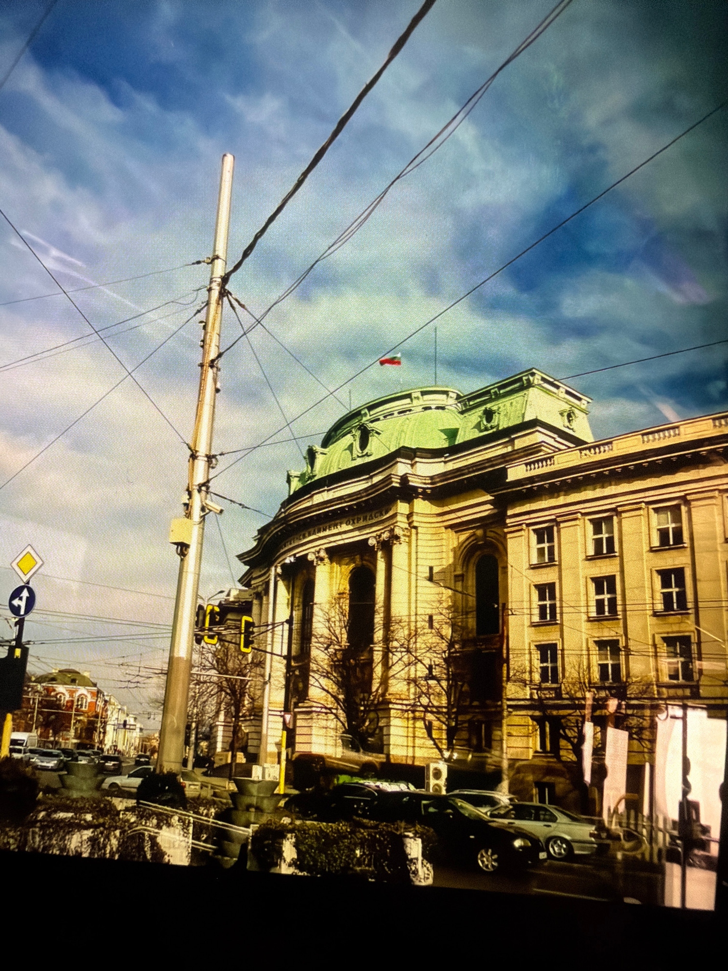The image shows a building with a green dome and a Polish flag on top, likely a government or historical building. The sky is partly cloudy. Power lines run across the foreground. There's a street sig…read more