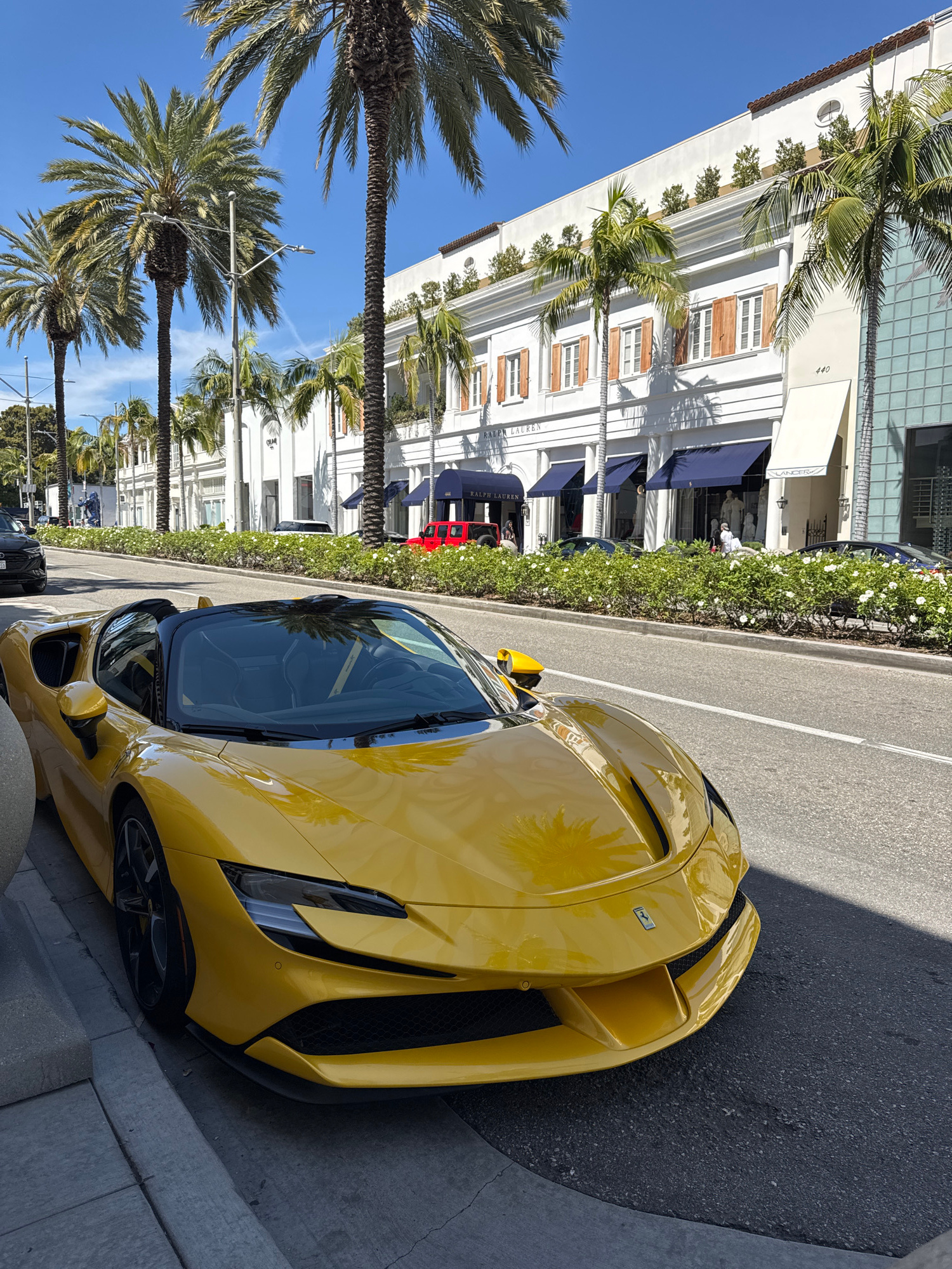 A yellow Ferrari SF90 is parked on the side of a street in Beverly Hills, California, United States. Palm trees line the street, and there are white buildings with awnings behind the car. Other cars a…read more
