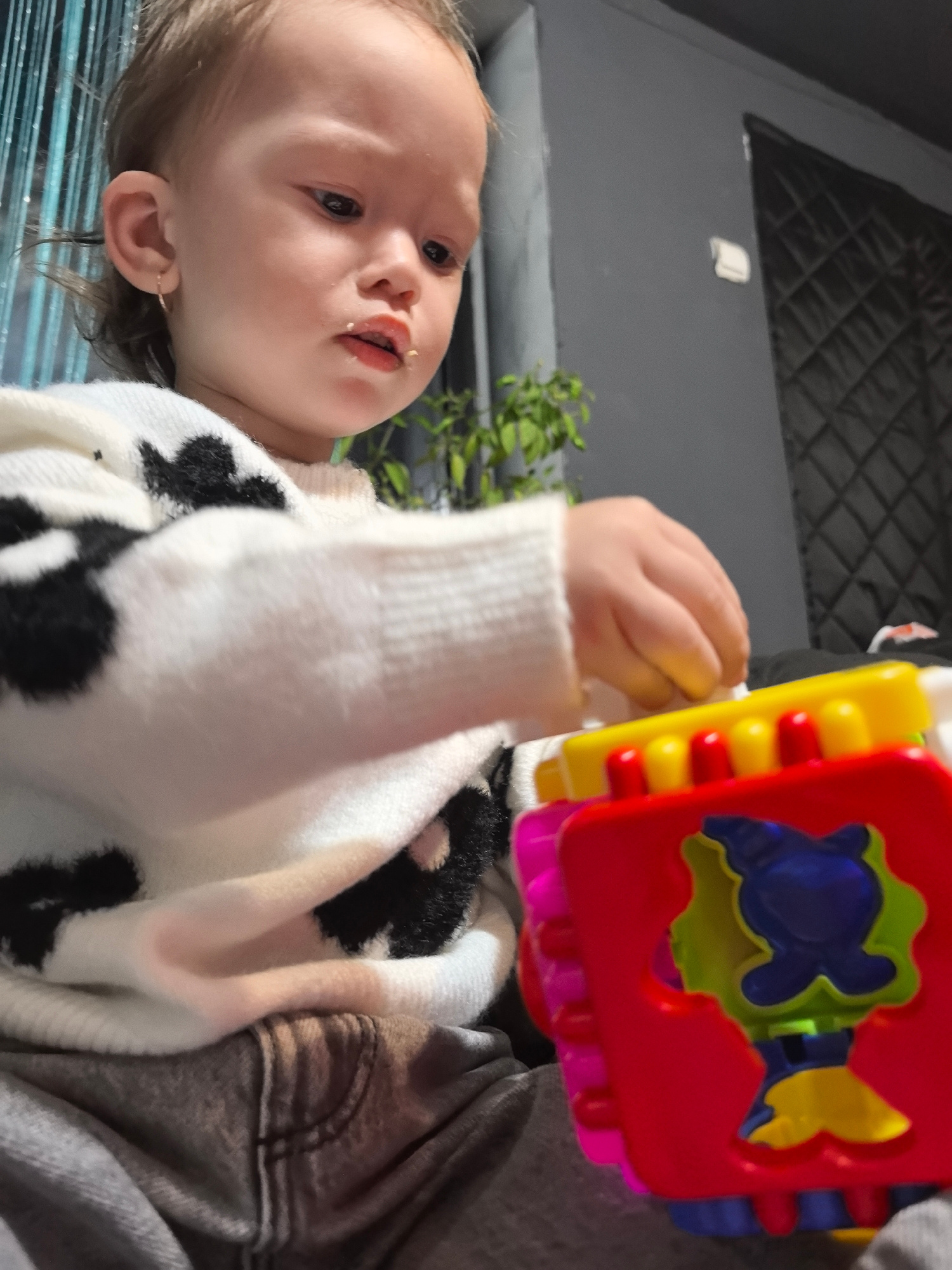 The scene depicts a young child indoors, located in Noviy, Russia. The child, with light brown hair and a small gold hoop earring in the left ear, is seen from the upper torso, wearing a white sweater…read more
