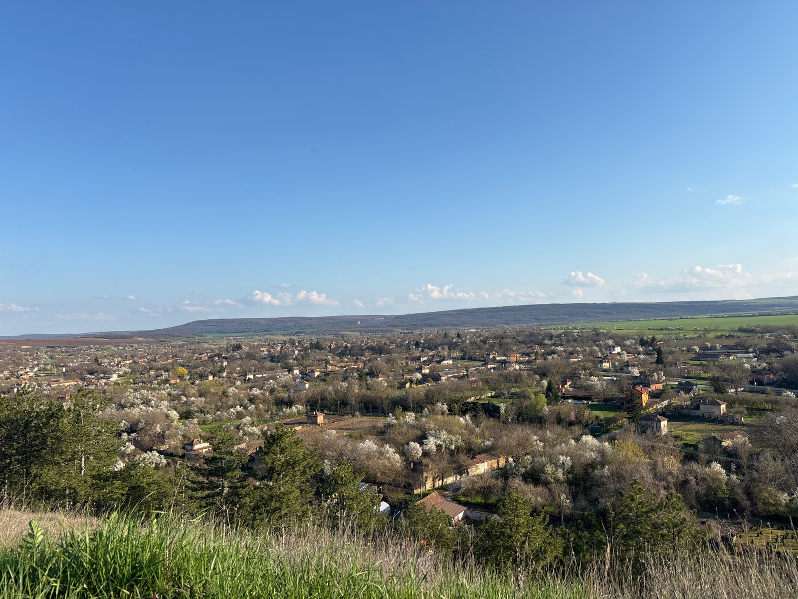 The image shows a view of a settlement or town from an elevated position. The foreground consists of tall grass and some trees. Beyond this, there is a dense cluster of buildings, trees, and vegetatio…read more