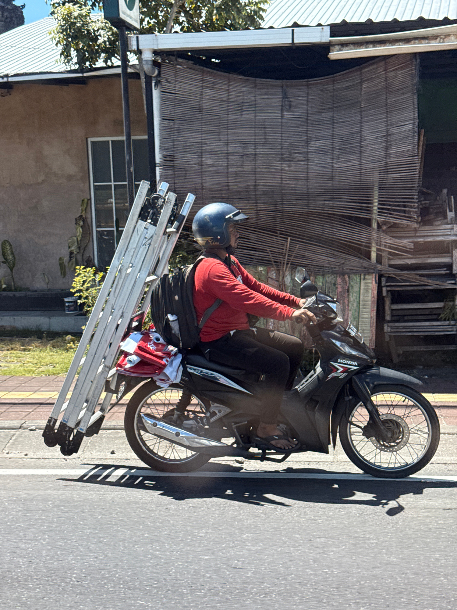 A person is seen riding a black Honda scooter, transporting a bundle of at least four large, silver folding ladders, and a red bag or item. The scooter is on a paved road with a white dividing line, nā¦read more