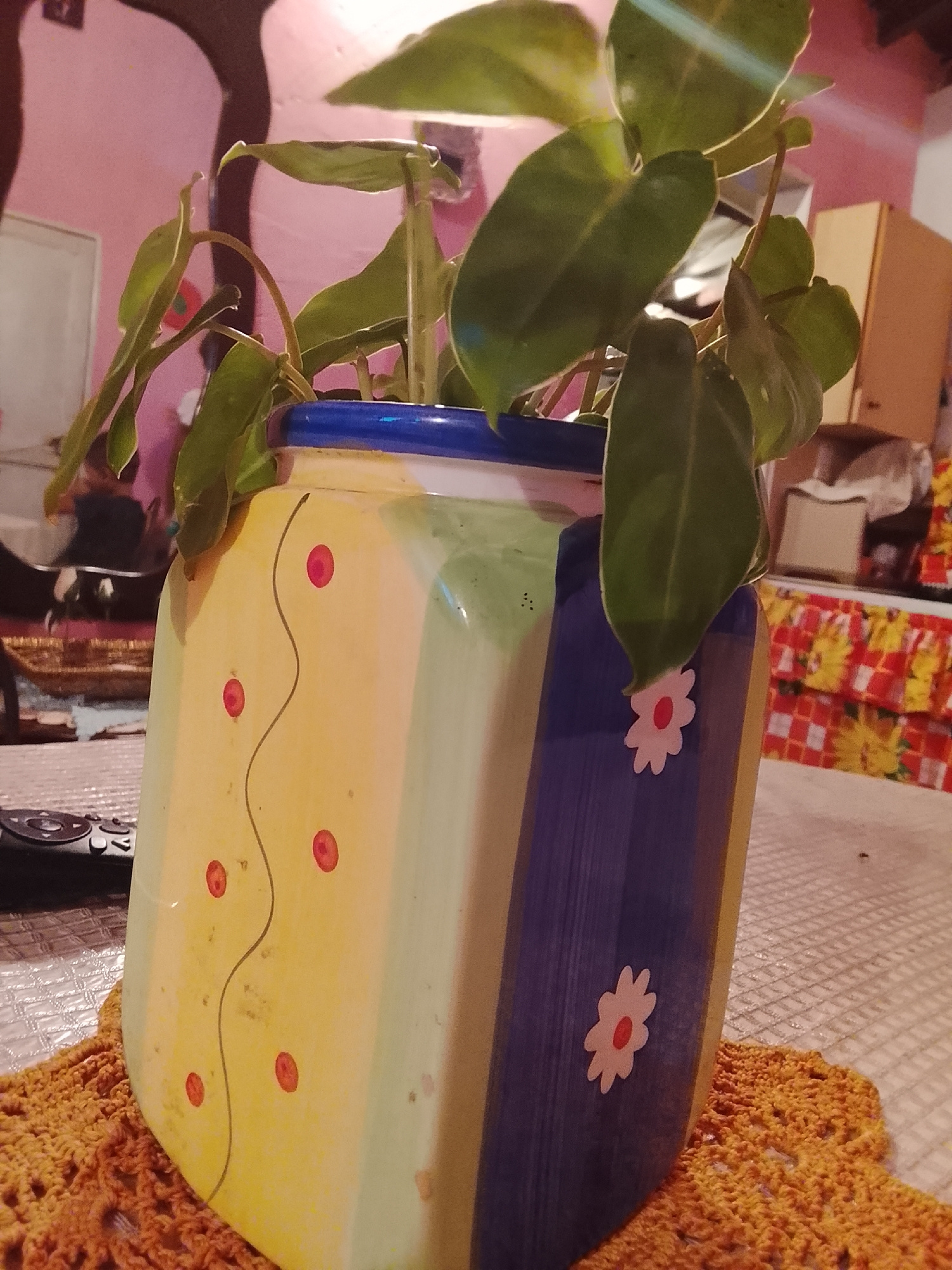 A vibrant green-leaved plant, possibly a philodendron or similar vining species with broad leaves, sits in a colorful, rectangular pot. The pot is designed with distinct vertical panels: a dominant ye…read more