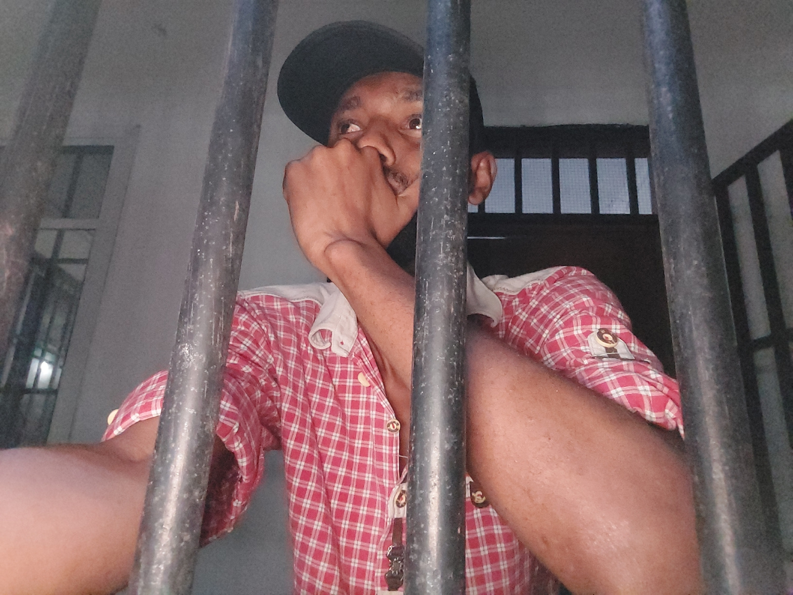 A man is seen through metal bars, wearing a black hat and a red and white checkered shirt. His right hand is raised to his face. The background reveals a window with bars or blinds. There is no verifi…read more