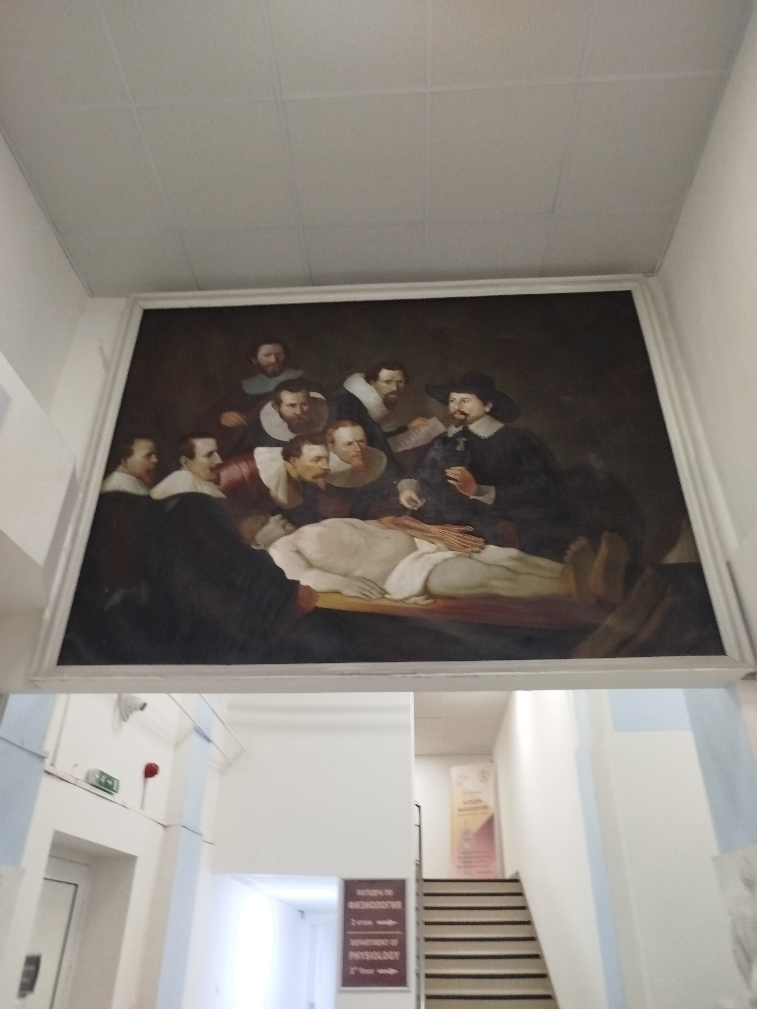 The image shows a reproduction of Rembrandt's "The Anatomy Lesson of Dr. Nicolaes Tulp" hanging on a wall in a building. The painting depicts a group of figures surrounding a cadaver laid out for diss…read more
