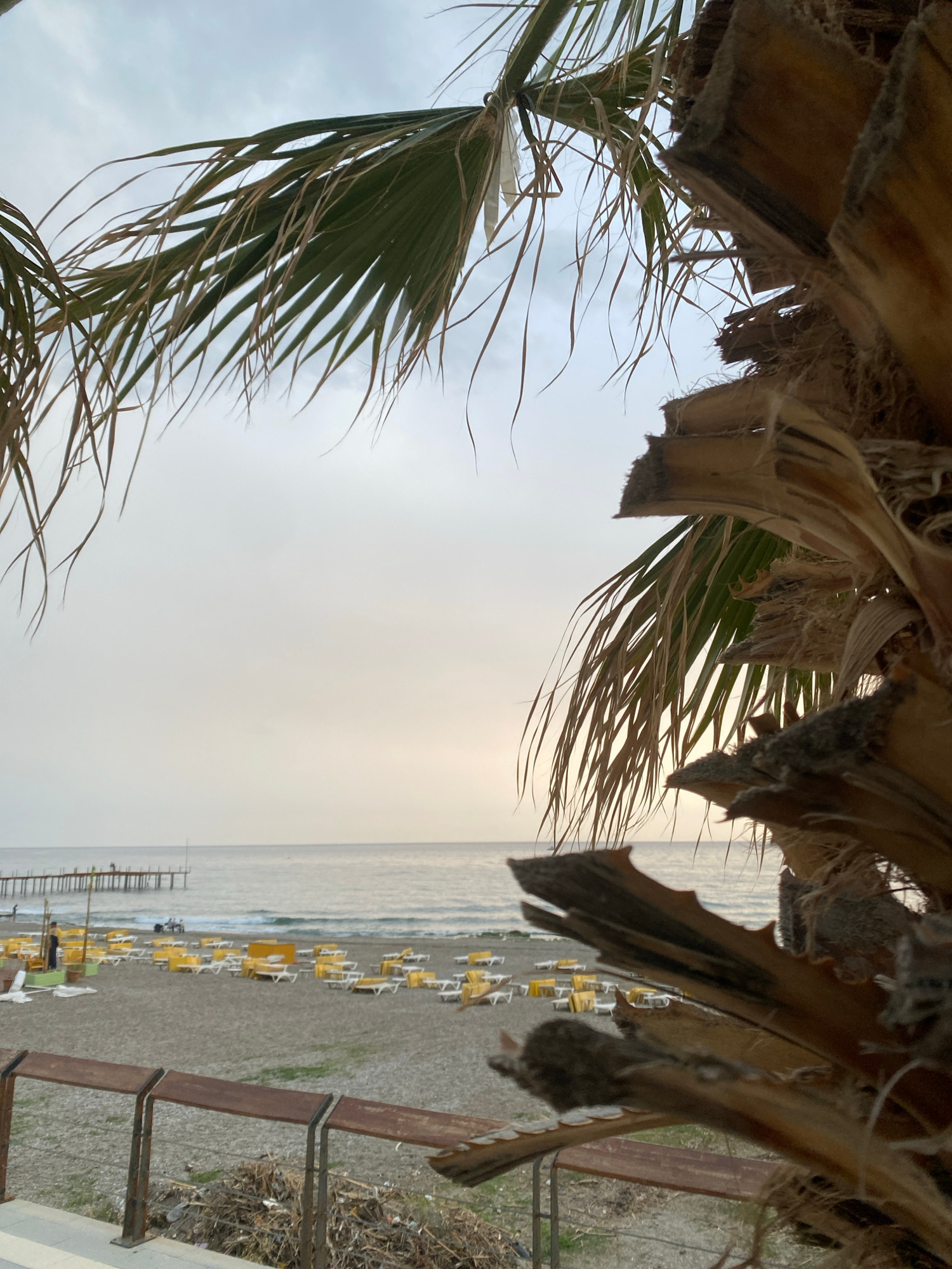 The image depicts a coastal scene, likely a beach, framed by palm tree foliage. The scene is viewed from beneath the fronds of a palm tree, looking out towards a beach and the sea. The sky is overcast…read more