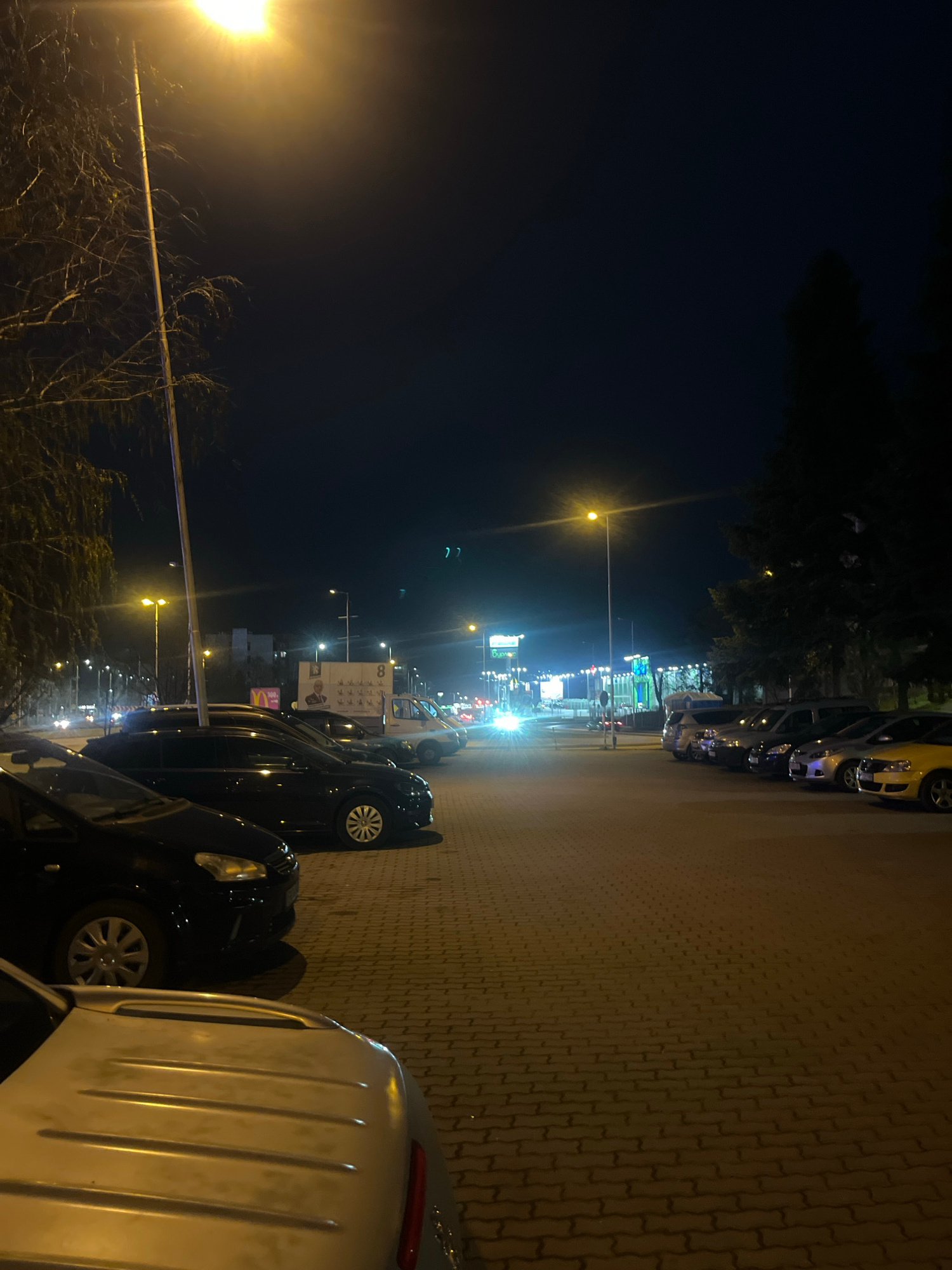 The image depicts a street in Veliko Tarnovo, Bulgaria at night. The view is from a low angle, oriented vertically. The road is paved with interlocking blocks. Cars are parked along the right side of…read more