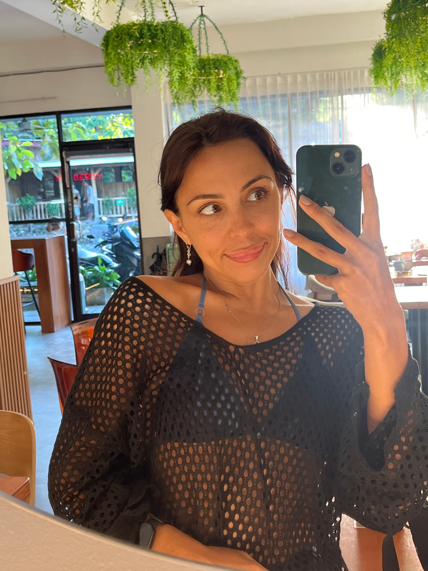 A woman takes a mirror selfie indoors, holding a dark green iPhone with her right hand. She has dark hair, brown eyes, and light brown skin, and is looking directly at the camera with a subtle, pleasaβ¦read more