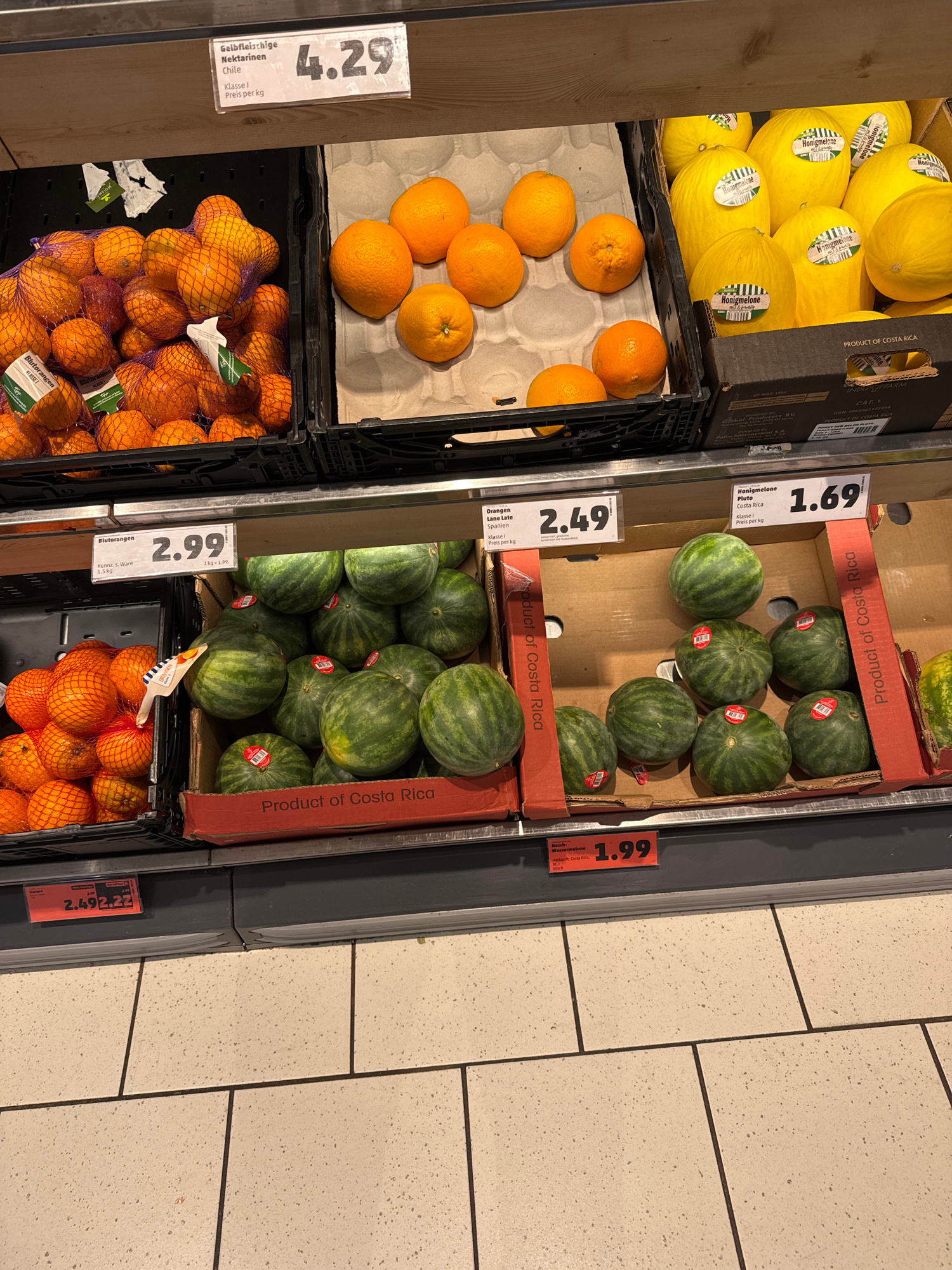 This image shows a produce section in a supermarket in Remscheid, Germany. The location is implied by the German language on the price tags and product labels. There are four types of fruits displayed…read more