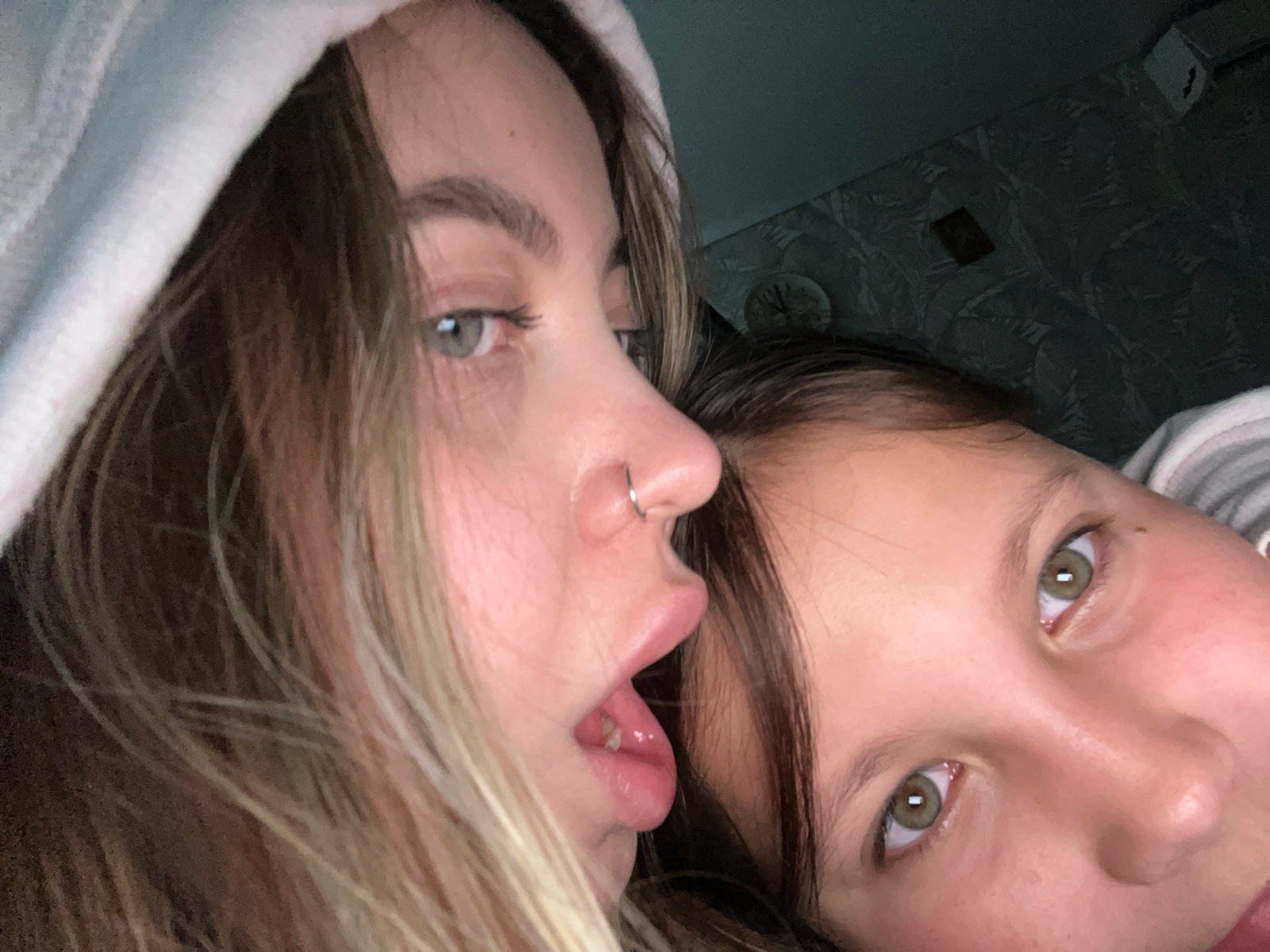 Two young women are positioned closely together, likely in an indoor setting. The woman on the left has light brown hair with blonde highlights and is wearing a white hooded sweatshirt. She has a nose…read more