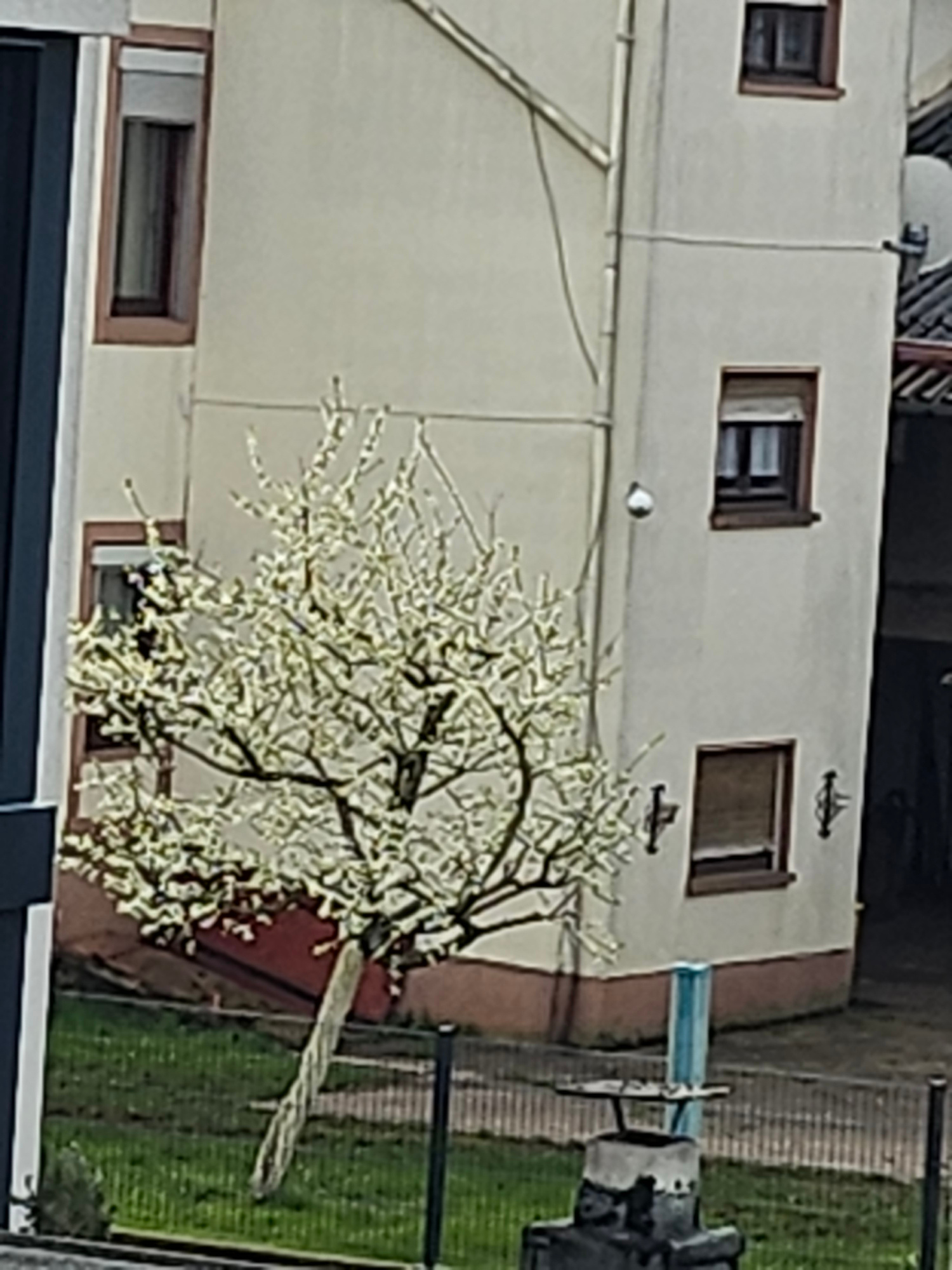 Here is a description of the image: The image depicts a light-colored building with multiple windows and architectural embellishments, potentially located in Trier, Germany. A blossoming tree with wh…read more