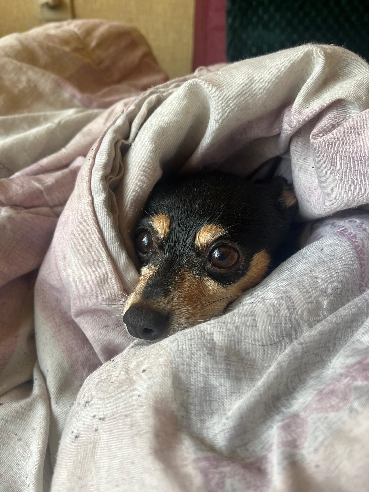 A black and tan Chihuahua is nestled in a light purple and white patterned blanket. The dog's head is visible, with its eyes open and focused towards the camera. The blanket is draped around the dog,…read more