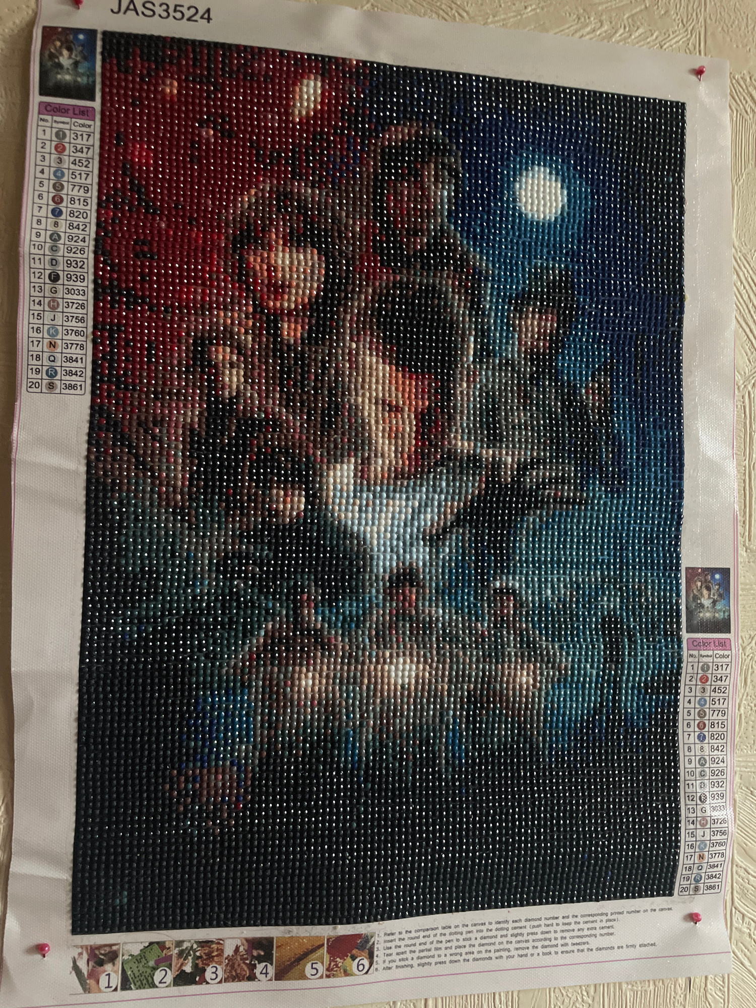 The image presents a partially completed diamond painting canvas, depicting a vibrant, abstract cosmic scene resembling a nebula or galaxy. The artwork features swirling patterns of deep blues, rich r…read more