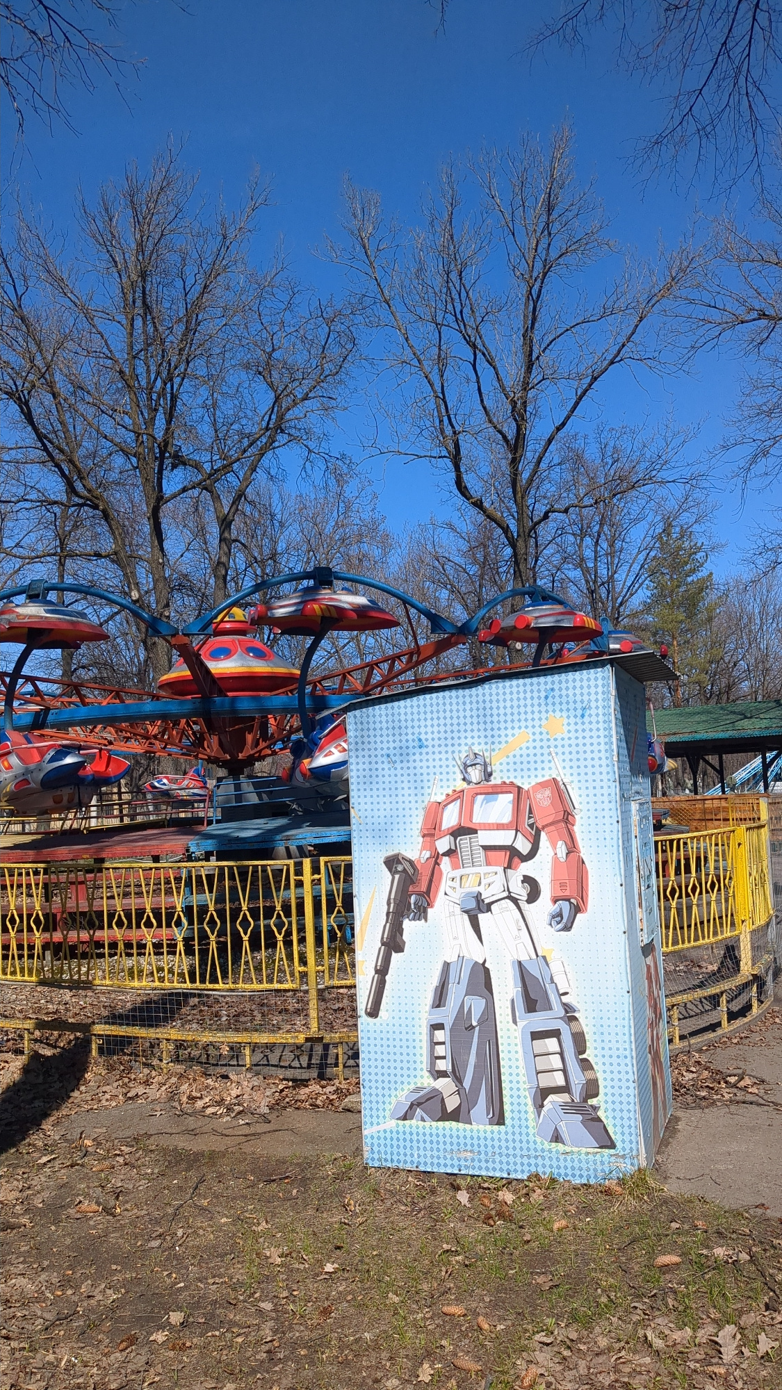 In Ulyanovsk, Russia, a colorful amusement ride stands in a park, featuring red, white, and blue rocket-shaped cars suspended from a blue metal frame. A large, rectangular sign with a drawing of a tra…read more