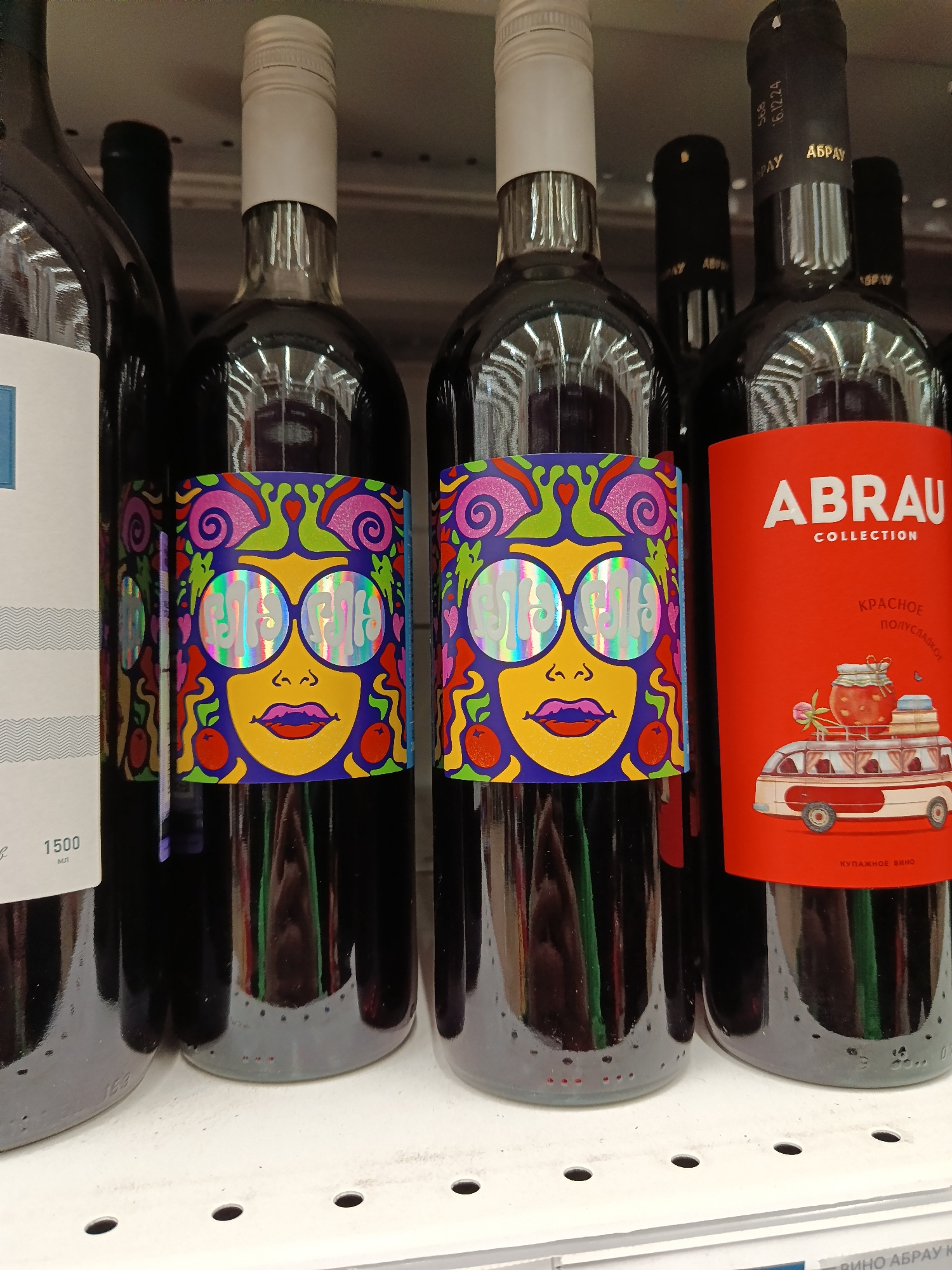 The image shows several bottles of wine lined up on a shelf. Two of the bottles have colorful labels featuring a person's face with large glasses. One bottle has a red label with the words "ABRAU COLL…read more