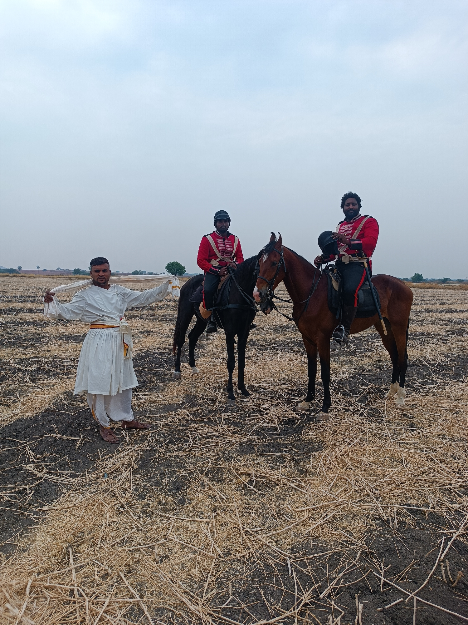 The scene is set in an open, harvested field in Kottalapalli, India, under an overcast sky. The ground consists of dark soil covered sparsely with light brown, dry crop stubble. Three adult males are…read more