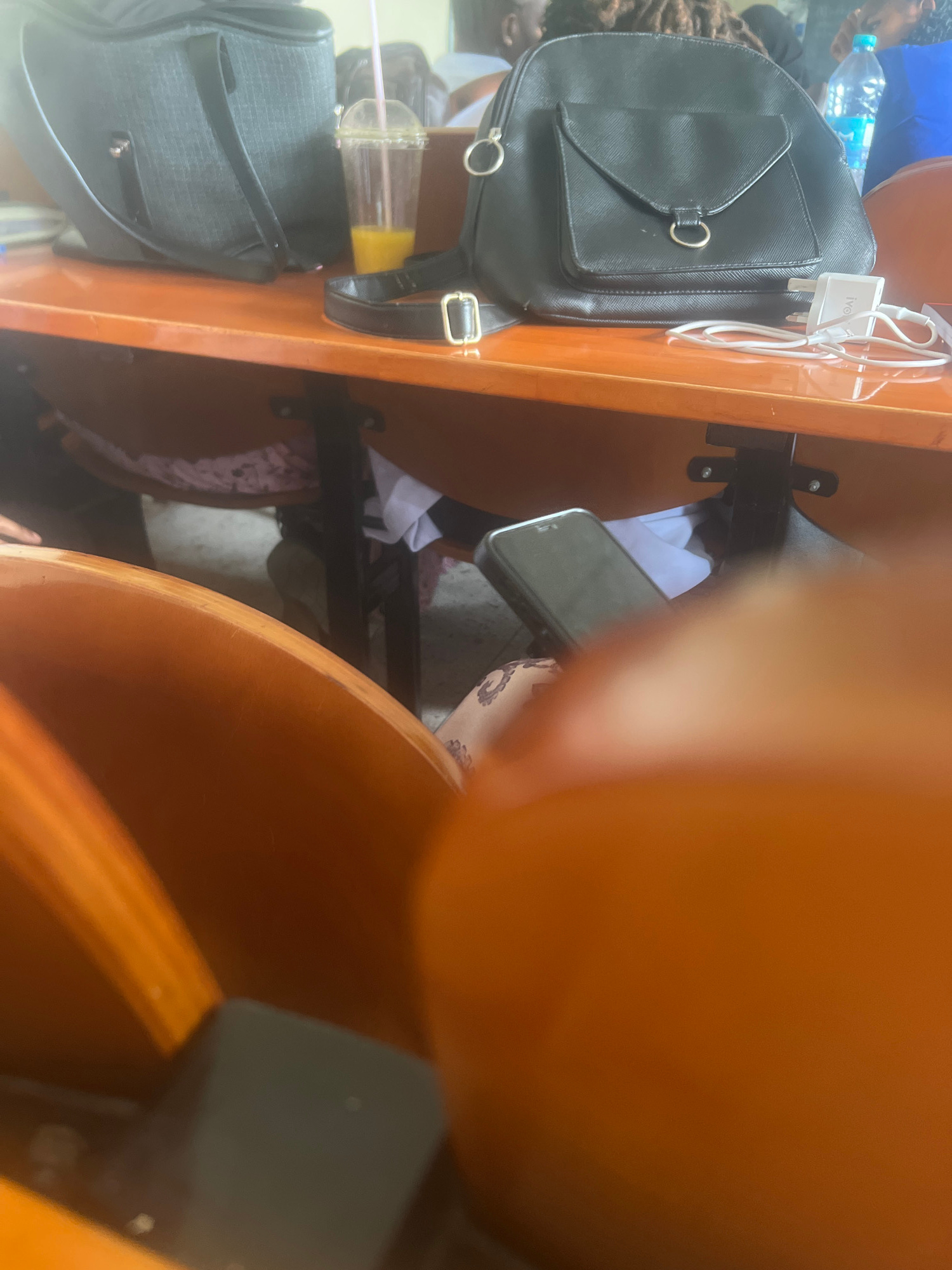 This image captures an indoor scene, likely a classroom, lecture hall, or study area in Dar es-Salaam, Tanzania, viewed from a slightly elevated and tilted perspective. A blurred, warm brown object oc…read more