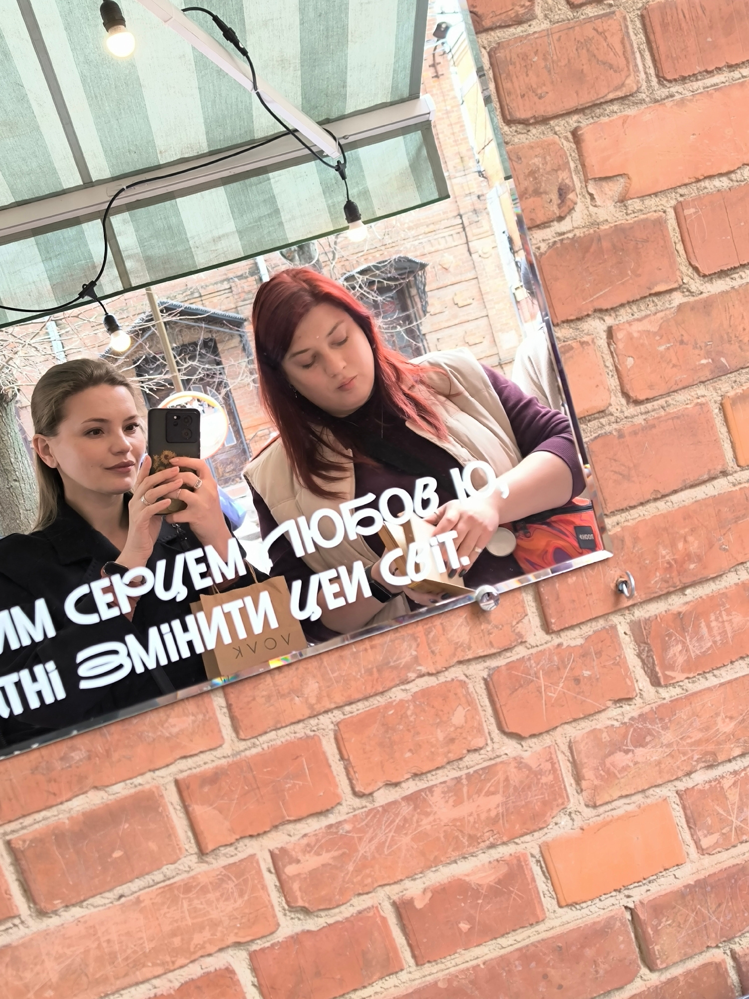 The image shows the reflection of two women in a mirror affixed to a brick wall. The mirror also reflects an awning with string lights above a building. One woman, on the left, is holding a smartphone…read more