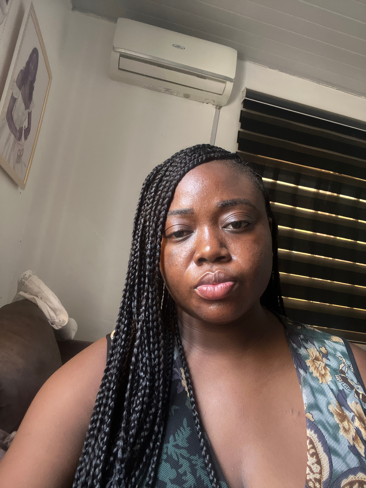A close-up, tilted portrait features a dark-skinned woman with a relaxed, neutral expression, possibly with a slight pout. Her face appears somewhat shiny, and she has long, dark box braids styled ove…read more