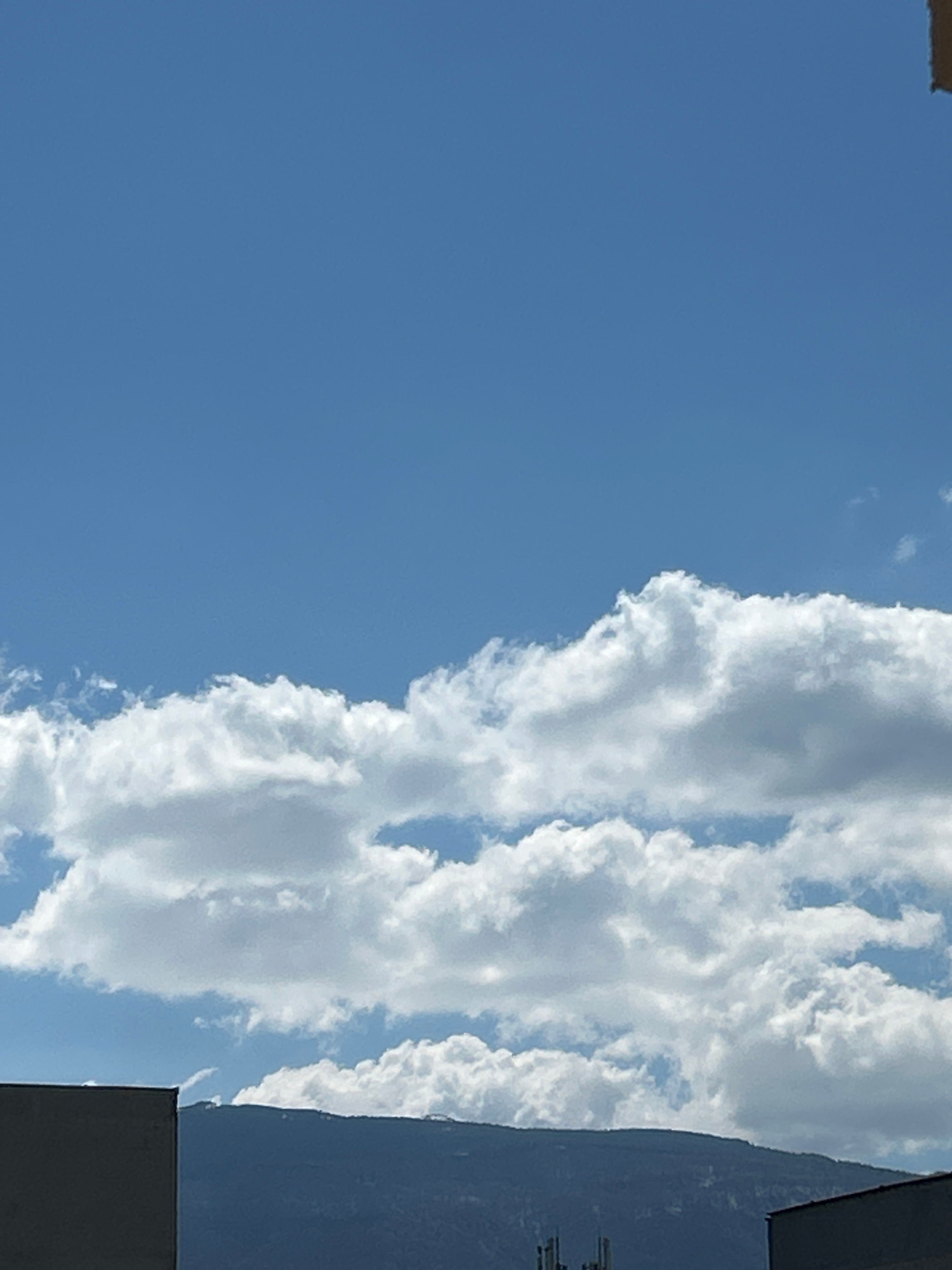 The image shows a vertical view of a blue sky with fluffy white clouds. A dark gray building is partially visible on the right side of the frame. The image could be taken in an urban area. Sofia, Bulg…read more
