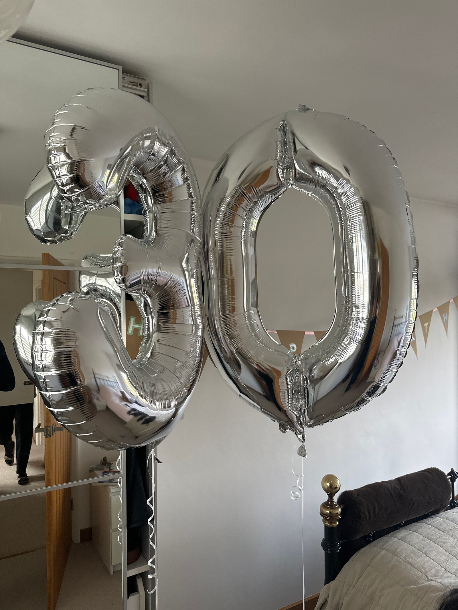 This image depicts an indoor scene within a private residence in Tunbridge Wells, United Kingdom, specifically a bedroom or similarly furnished room decorated for a 30th birthday celebration. The cent…read more