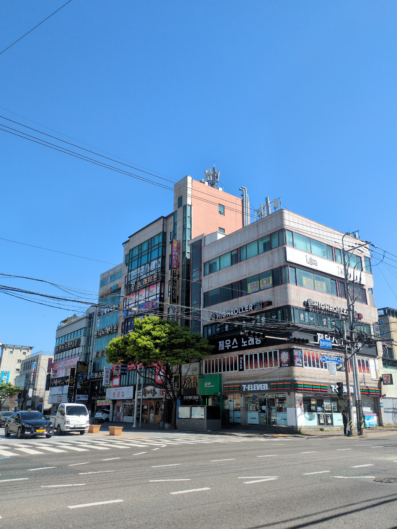The image captures a street view in Ulsan, South Korea. A tall building with multiple commercial establishments dominates the scene, showcasing a 7-Eleven store and other businesses. The structure is…read more