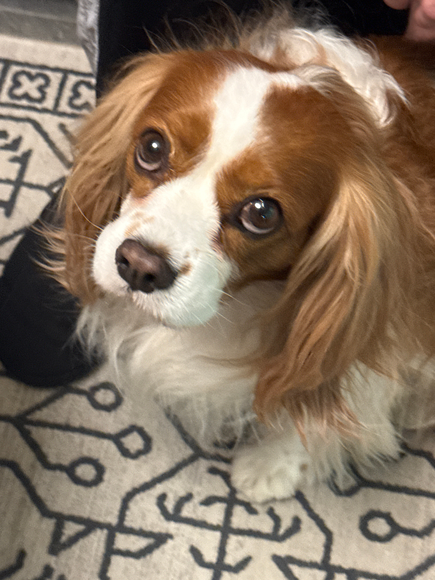 A tan and white Cavalier King Charles Spaniel is lying on a patterned rug. The dog is looking upwards, its head tilted slightly. The rug has a geometric pattern in black on a light-colored background.…read more