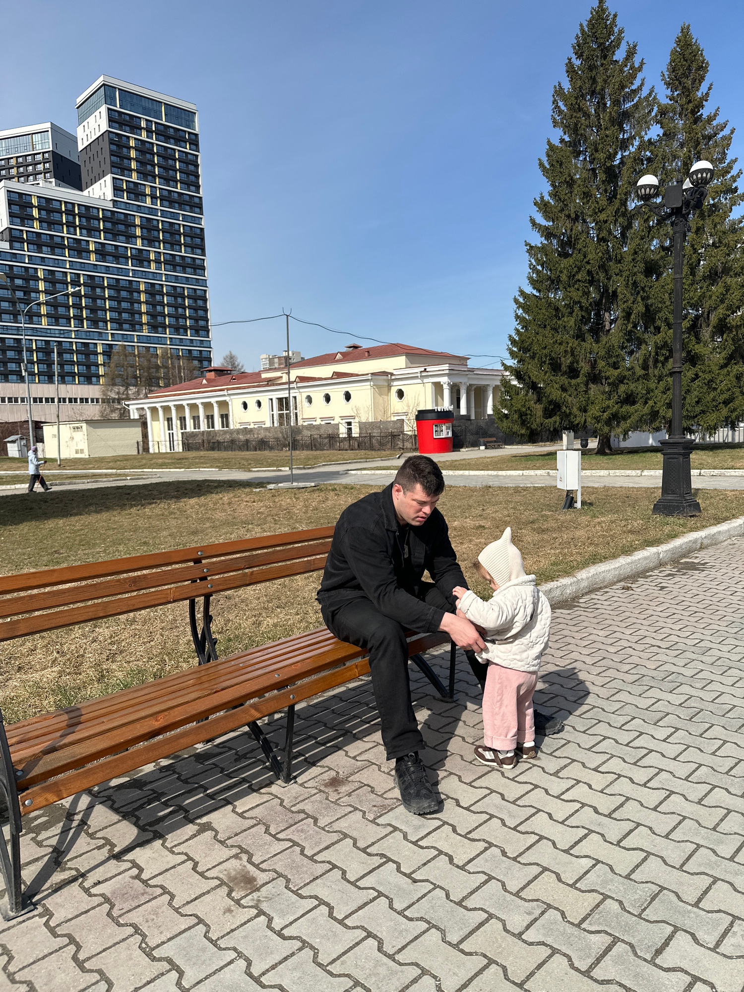 A man and a small child are in an outdoor setting. The man is seated on a wooden bench, dressed in black, attending to the child. The child, wearing a light jacket and pants, is standing near the bencβ¦read more