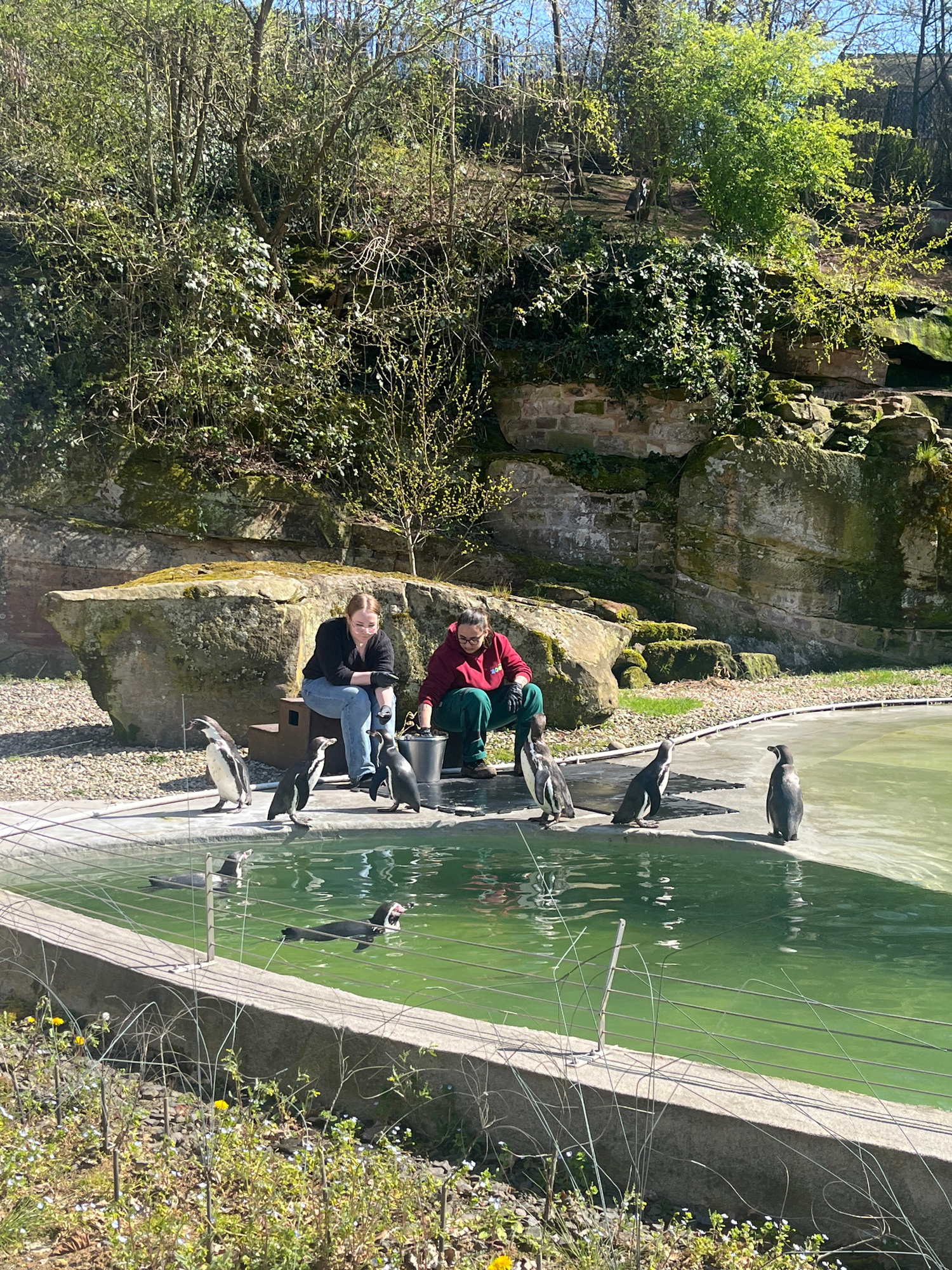 In Saarbrücken, Germany, two individuals are seated on a low bench alongside a penguin enclosure. The enclosure features a concrete wall surrounding a body of green water, with several penguins standi…read more