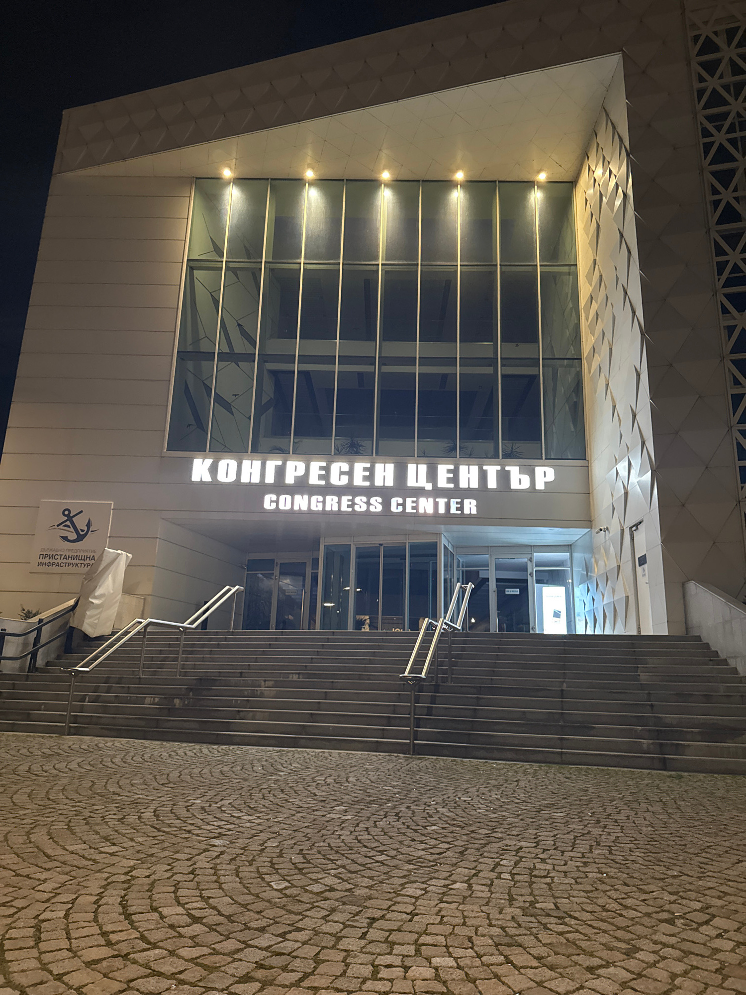 The image shows the Congress Center of Burgas, Bulgaria, at night. The building's facade is illuminated, highlighting the glass windows and the signage in both Bulgarian Cyrillic and English, "КОНГРЕС…read more