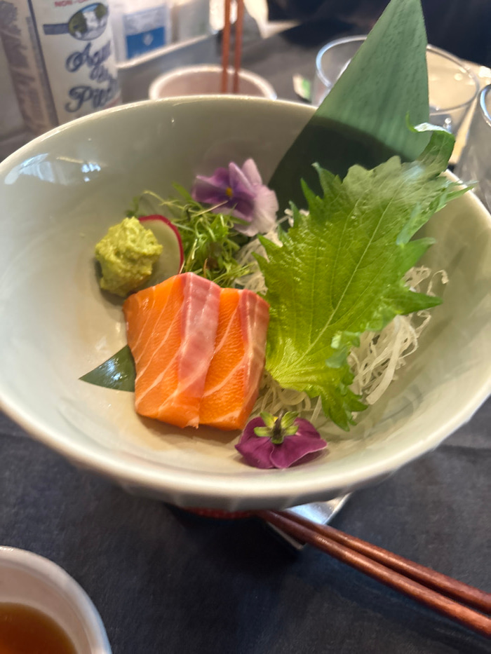 A top-down shot shows a bowl of sashimi. Two slices of salmon rest on a green leaf. A dollop of wasabi, microgreens, radish slices, shredded white vegetables, a large green leaf, and two purple flower…read more