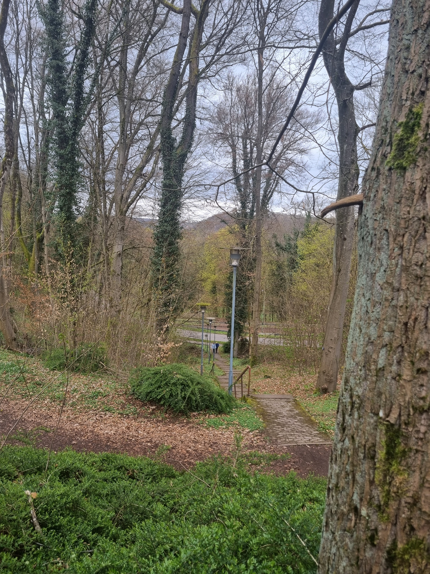 The image shows a park in Saarbrücken, Germany. The foreground features a large tree trunk with bark, with a tail hanging on the left. The midground displays a path through a wooded area, lined with b…read more