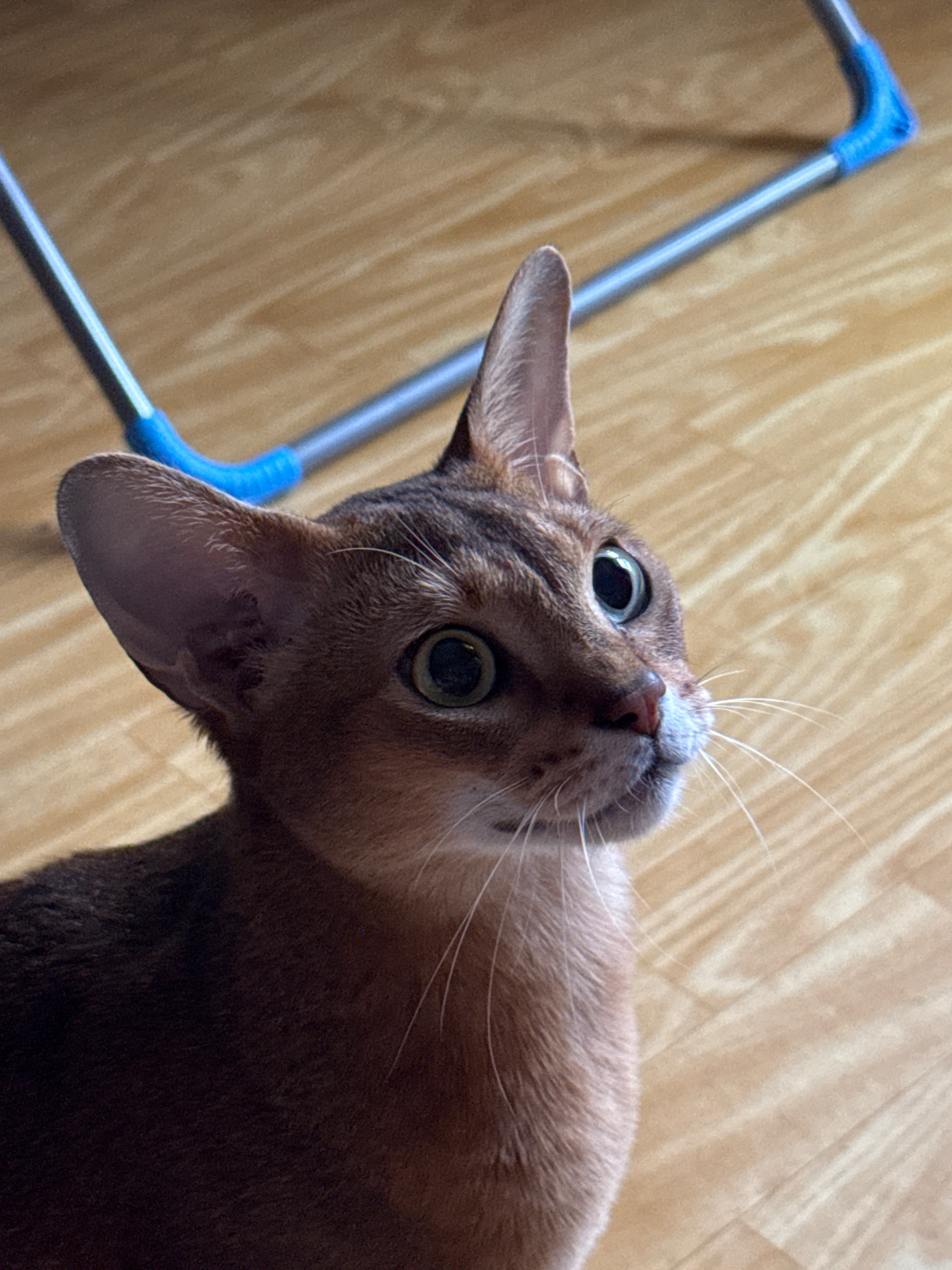 An upward-angled close-up shot captures a curious cat indoors in Chaikovsky, Russia. The main subject is an Abyssinian or similar breed cat, distinguished by its short, reddish-brown fur, large, expre…read more